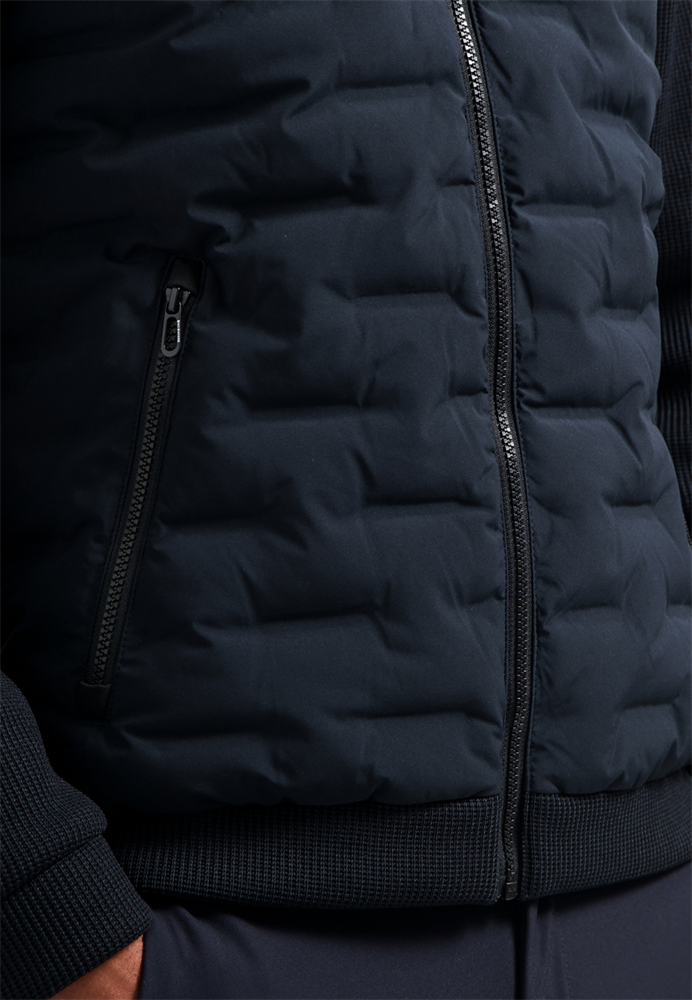 Diese All-Season-Jacke kombiniert eine gesteppte Front mit Strickärmeln und -rücken für besten Tragekomfort. Die Kapuze und Rippbündchen halten dich an kühlen Tagen warm. Ideal über einem Basic-Tee oder Hoodie für einen lässigen Layering-Look.