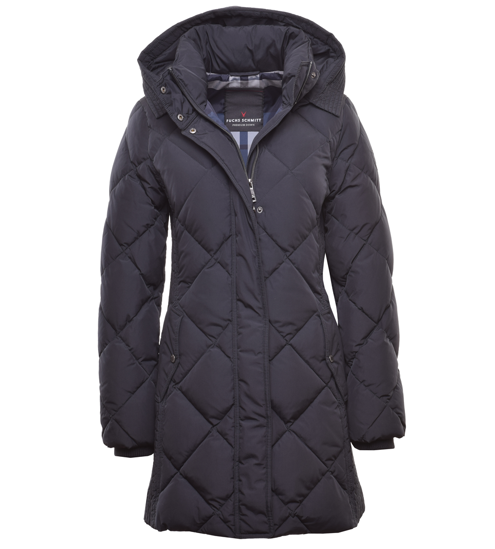 Daunenkurzmantel mit Stehkragen, abnehmbarer Kapuze, verdecktem Reißverschluss und Reißverschlusstaschen