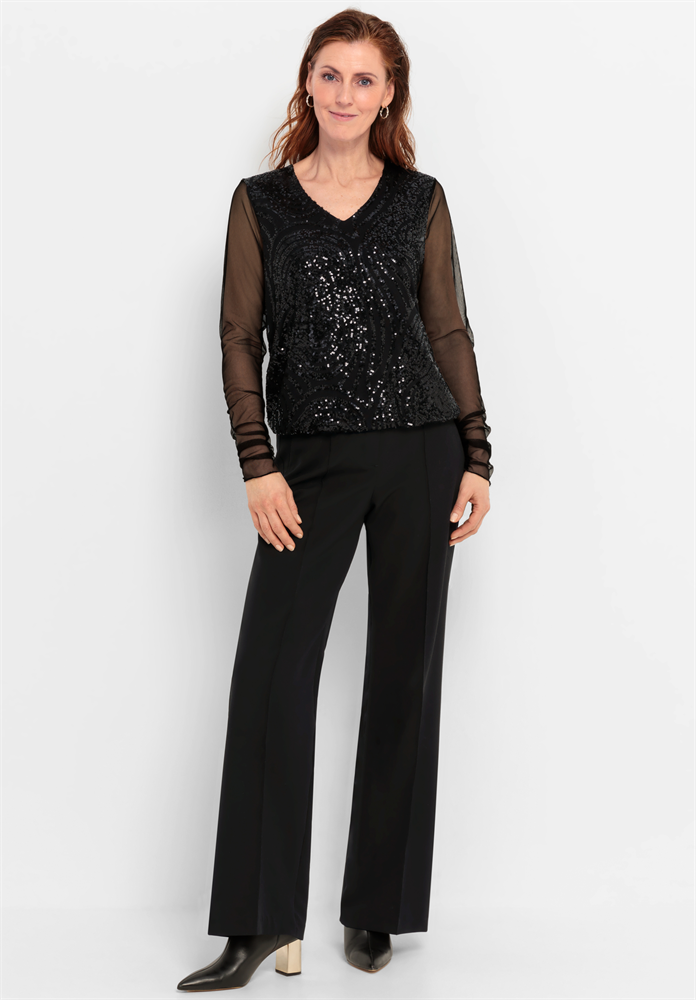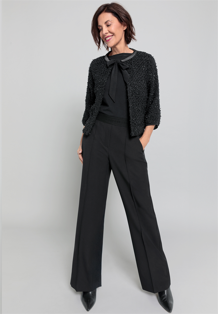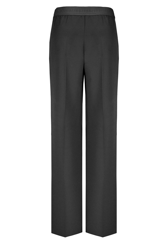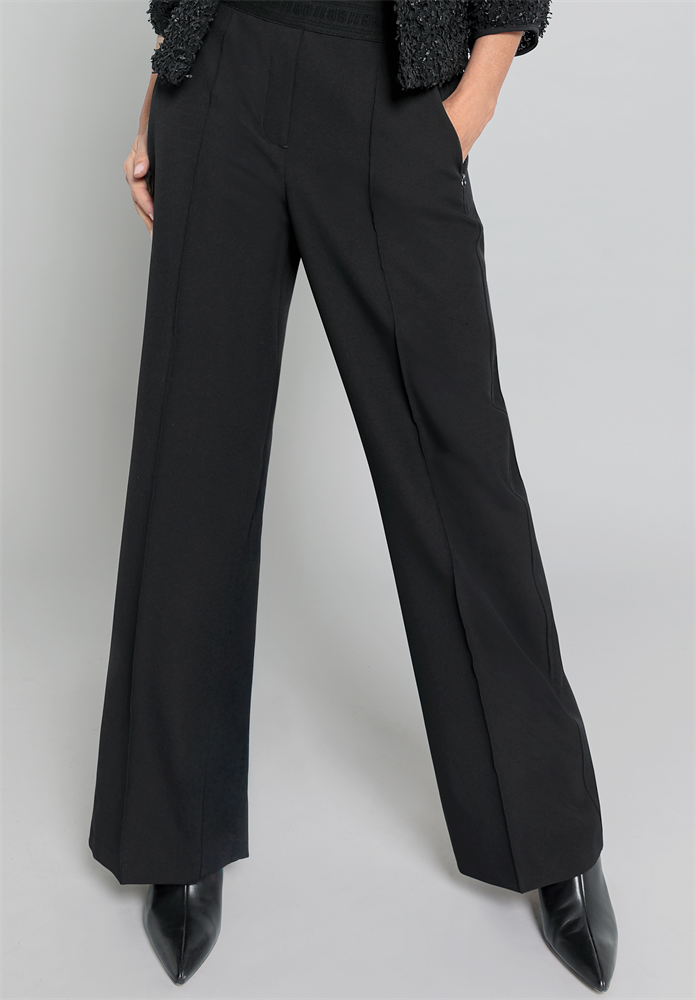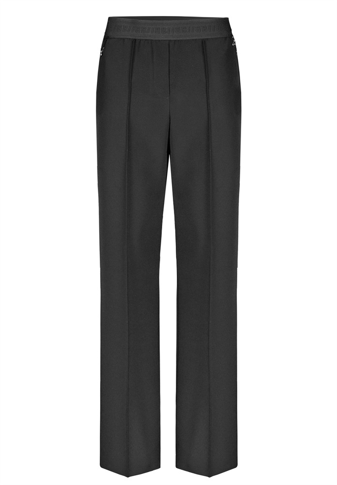 Zeitlos und modern! Unsere schwarze Stretch-Hose Parigi punktet mit ihrer geraden, langen Passform, den edlen abgesteppten Biesen und praktischen Zippertaschen. Der Logo-Gummibund sorgt für bequemen Sitz und macht die Hose zu einem vielseitigen Stylingpartner. Pflegeleichter Materialmix mit Elasthan schenkt angenehmen Tragekomfort und Bewegungsfreiheit. Elegant und unkompliziert, Parigi ist ein echtes Must-have für Ihre Garderobe.