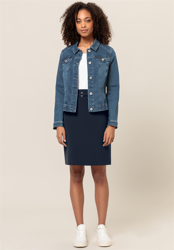 Denim forever - Jeansjacken sind zeitlos und immer modern! Unsere sportliche Jacke Tatja in blue Denim besticht in hochwertiger Baumwollqualität mit Elasthan und in Verbindung mit der geraden Passform ist sie super angenehm zu tragen. Im coolen Jeanslook mit authentischer Used-Waschung besitzt sie einen Hemdkragen, eine Knopfleiste und aufgesetzte Brustpattentaschen. Unser Tipp: Style Tatja lässig mit einem Shirt oder etwas schicker mit einer Bluse.