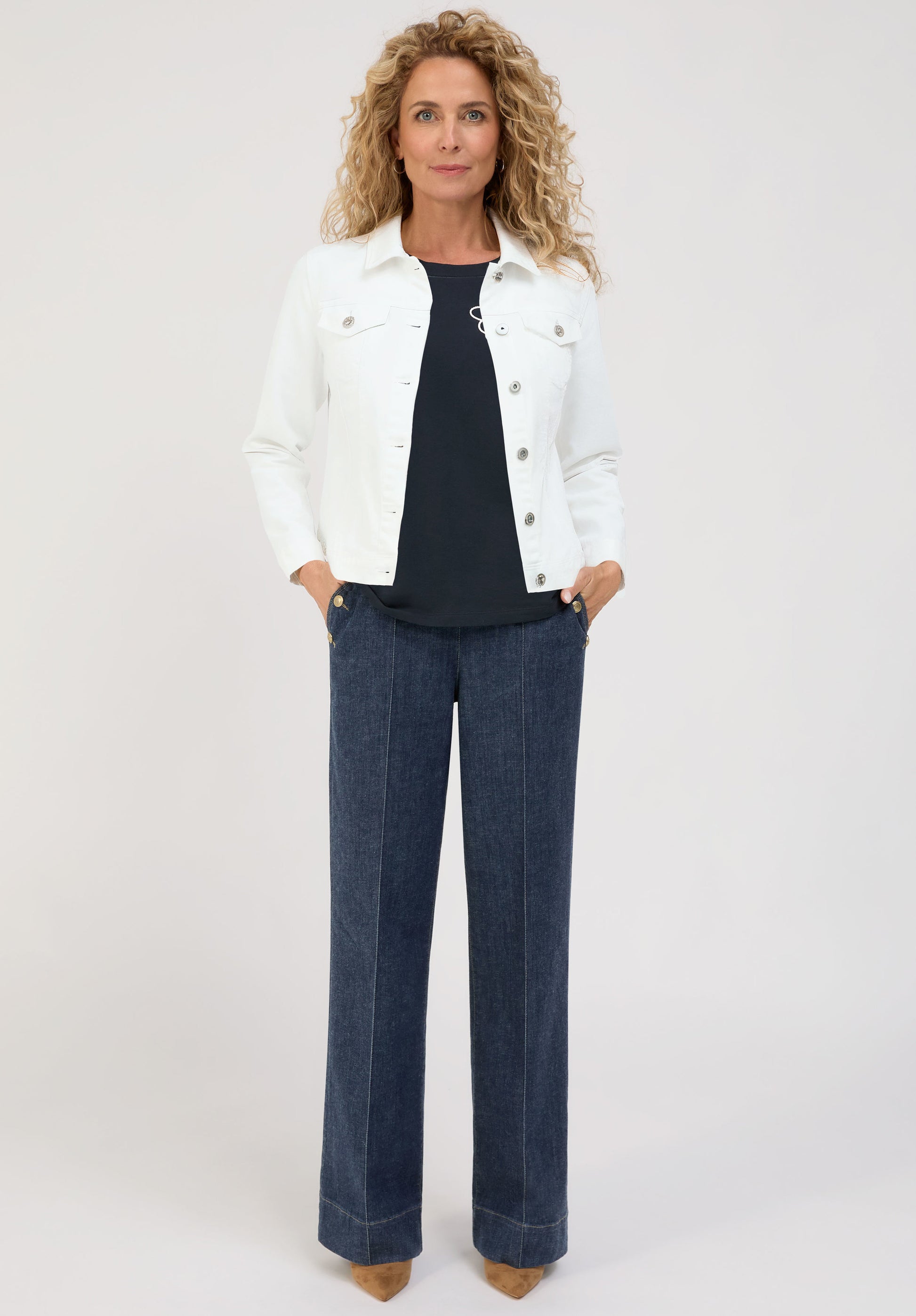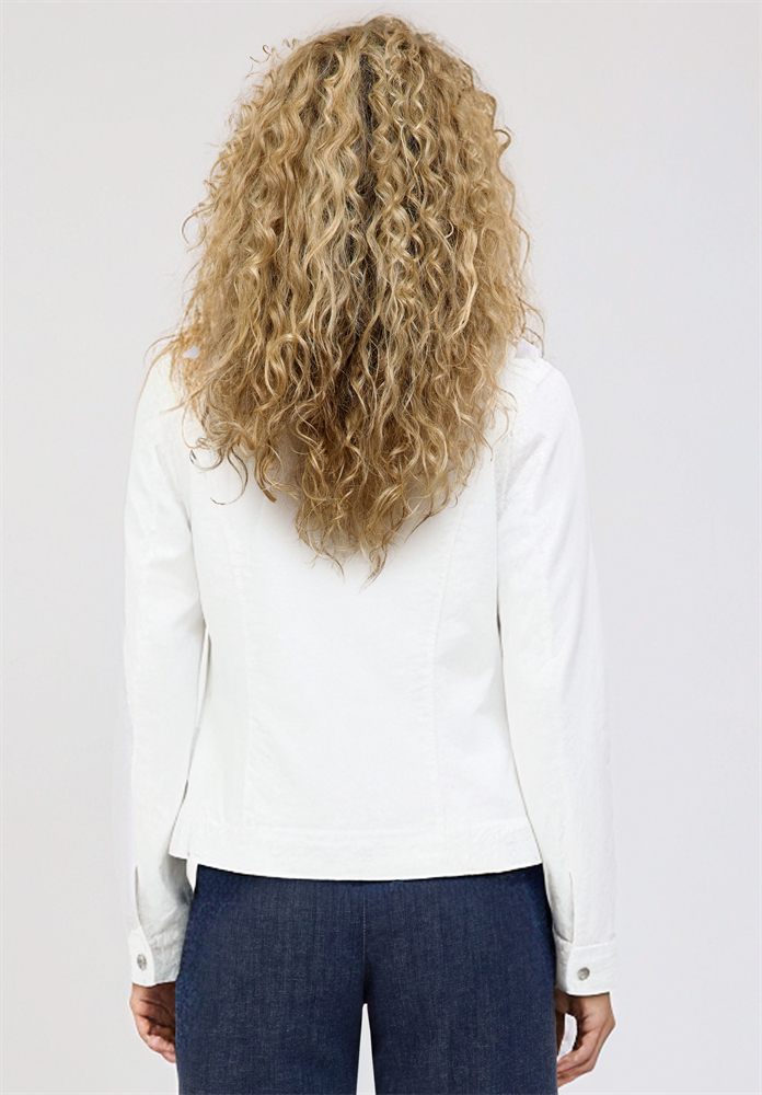 Ein vielseitiges Must-have: Unsere Jeansjacke June aus cleanem weißen Denim kombiniert klassische Elemente mit modernen Akzenten. Der stretchige Materialmix und die leicht taillierte Passform bieten optimalen Tragekomfort. Stilvolle Details wie der Kentkragen, die Knopfleiste mit Logo-Zierknöpfen und die Pattentaschen runden den Look ab. Mit ihren langen Ärmeln und dem typischen Jeansdesign ist June der perfekte Begleiter für trendige Freizeit-Looks oder entspannte Alltagskombinationen.