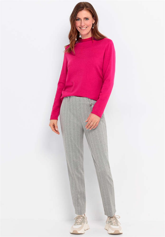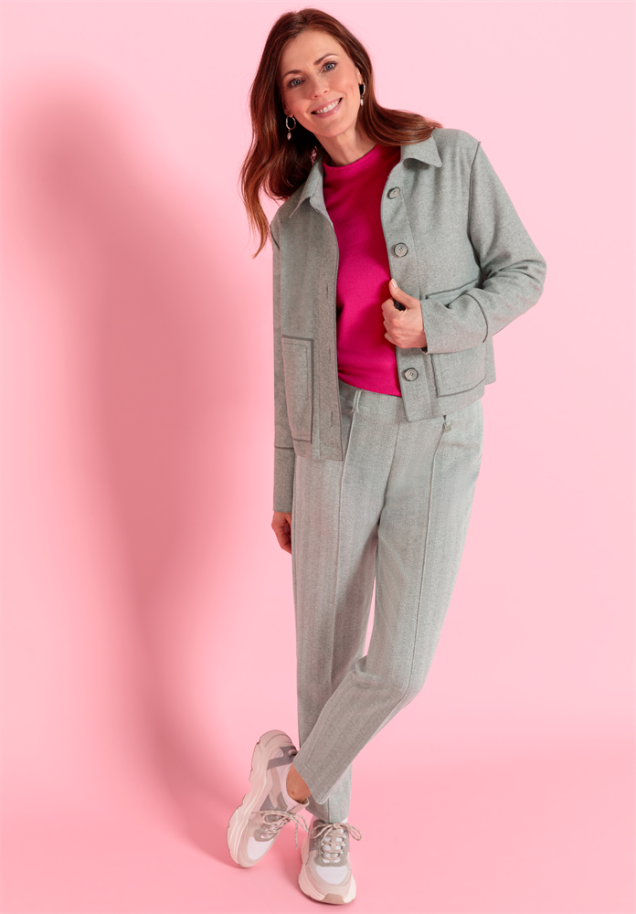 Unsere neue Jegging-Hose Denver aus softer Jerseyqualität im trendigen Fischgrätdesign verbindet Style und Komfort. Der hochwertige Materialmix mit Elasthan und der Gummibund sorgen für eine perfekte Passform und hohen Tragekomfort. Modische Details wie die abgesteppte Biese vorne, Gürtelschlaufen und kleine Saumschlitze geben der Schlupfhose einen lässig-eleganten Look. Ein vielseitiger Allrounder, der sich mit Bluse und Loafern businesstauglich stylen lässt oder mit Shirt und Sneakern entspannt in den Alltag passt.