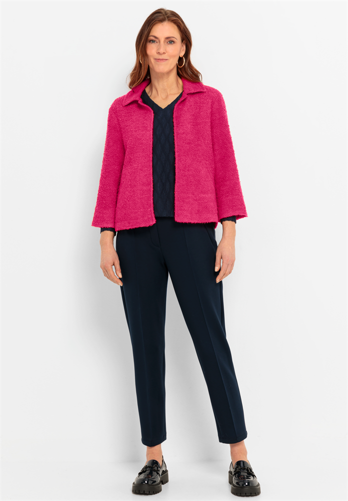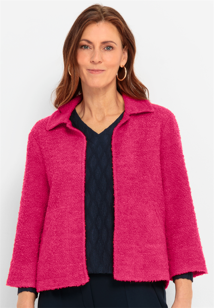 Entdecken Sie unsere neue, verschlusslose Kurzjacke Kate in angesagter Trendfarbe! Das hochwertige Bouclé-Material mit einem kleinen Wollanteil verleiht der Jacke einen besonders weichen Griff und maximalen Tragekomfort. Die ungefütterte, gerade Passform, der stylische Hemdkragen und die 3/4-Ärmel sorgen für einen modernen, entspannten Look. Ob casual mit Shirt und Jeans oder elegant mit Bluse und Businesshose, unsere vielseitige Jacke Kate ergänzt jedes Outfit perfekt.