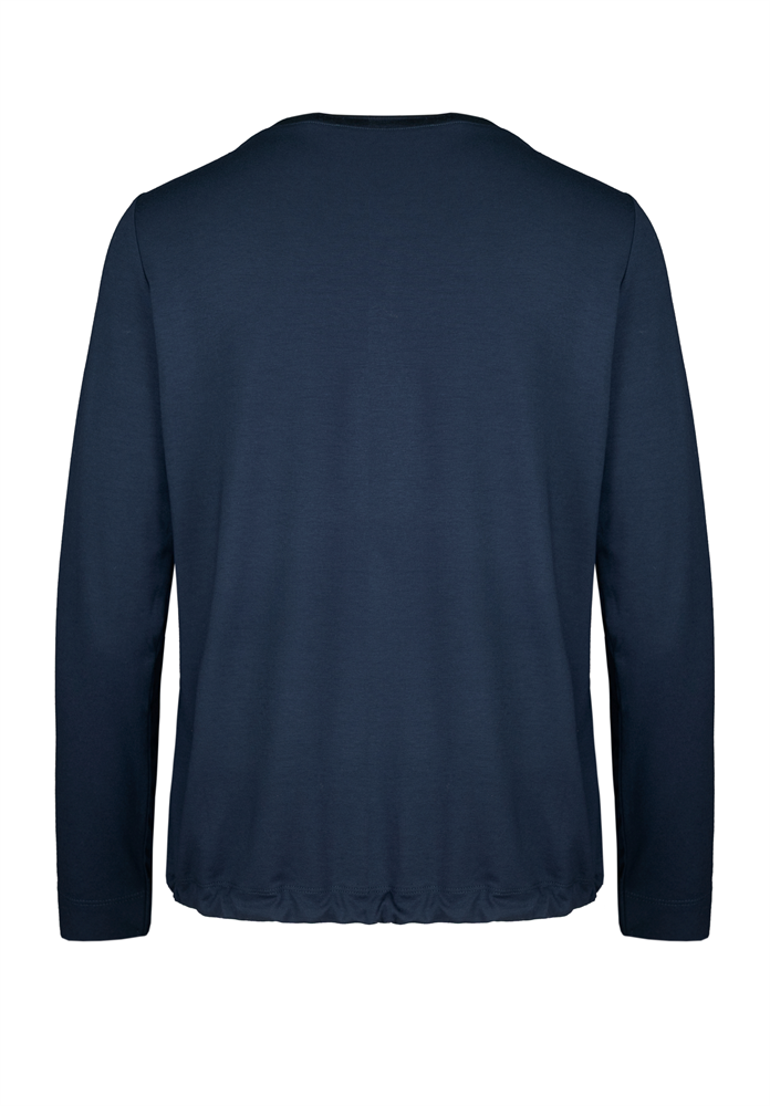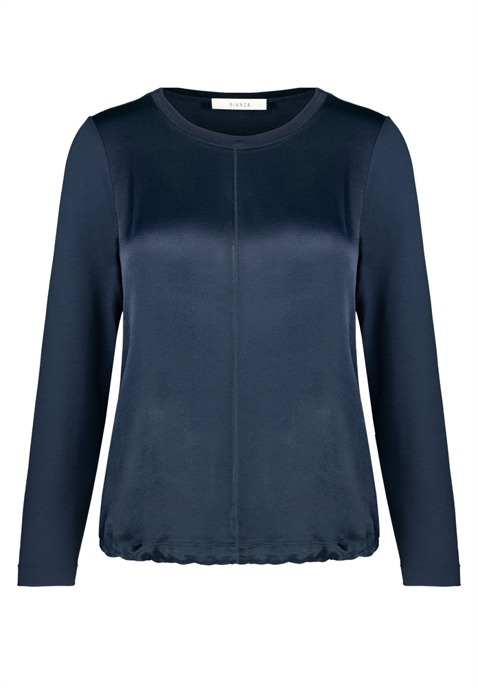 * Schönes Rundhalsshirt mit Strickblende am Ausschnitt * Hochwertige Viskose mit Elasthan * Mit Tunnelzug und Bindeband am Saum, Langarm * Gerader Schnitt, lockere Passform * Bei Gr. 38: Länge ca. 62 cm