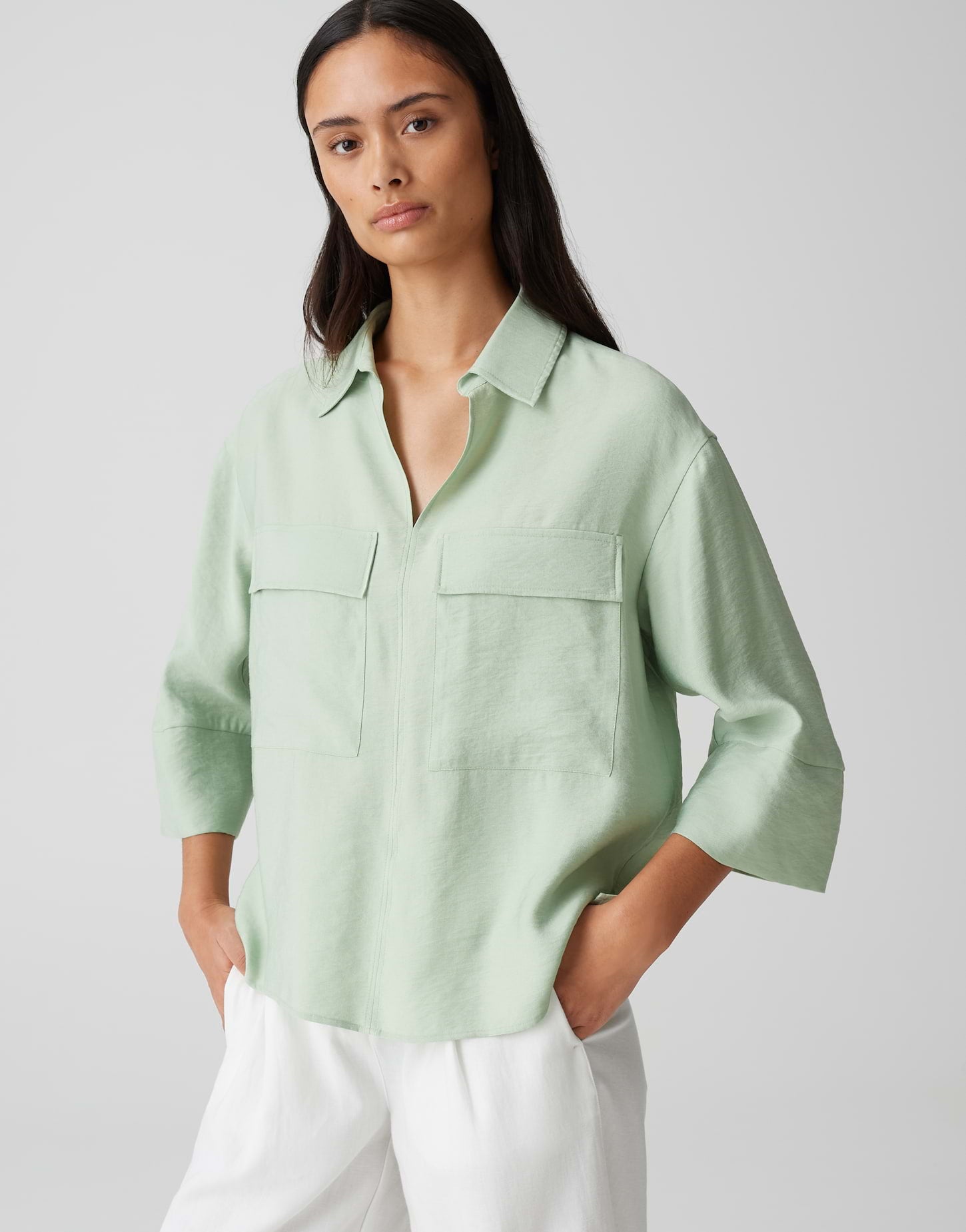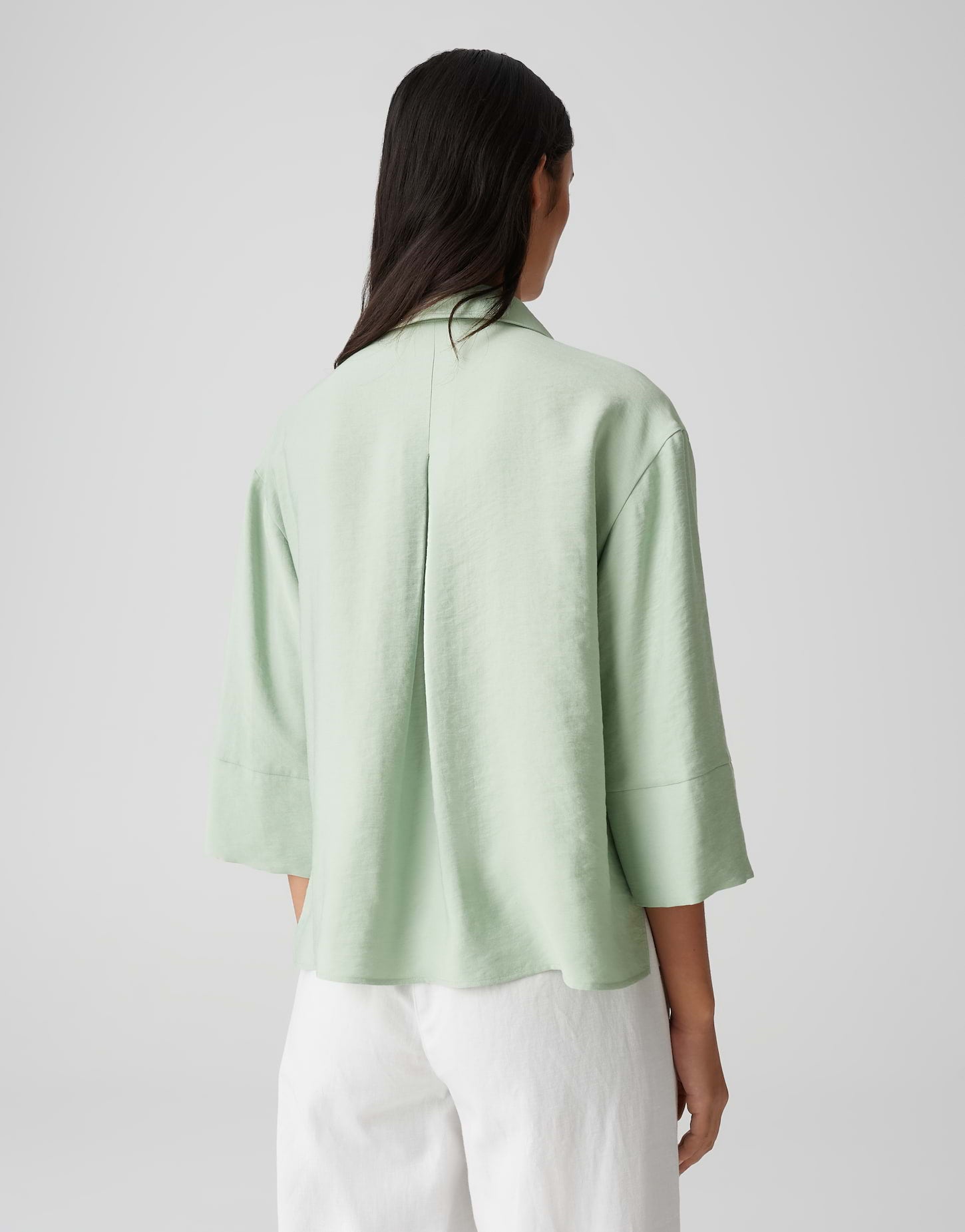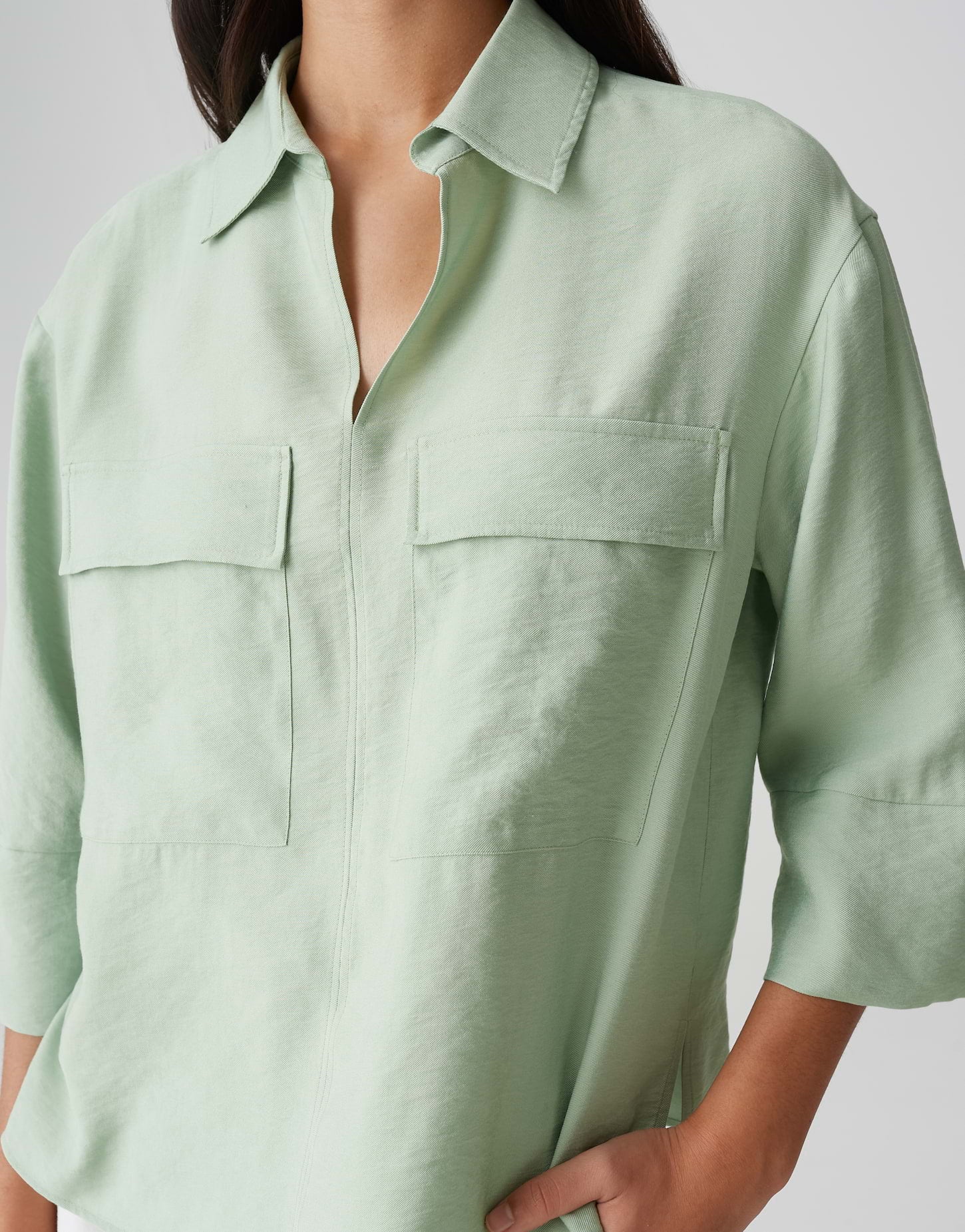 lockere Passform, leicht ausgestellt geschnitten, 3/4 Arm, V-Ausschnitt, Polokragen, Rückenlänge ca. 61 cm bei Größe 36, Model Größe 177 cm ? trägt Größe 36, Webware, dezente Struktur, kühler Griff, fließender Fall, aufgesetzte Pattentaschen, Kellerfalte im Rücken, abgerundeter Saum, Schlitze in den Seiten