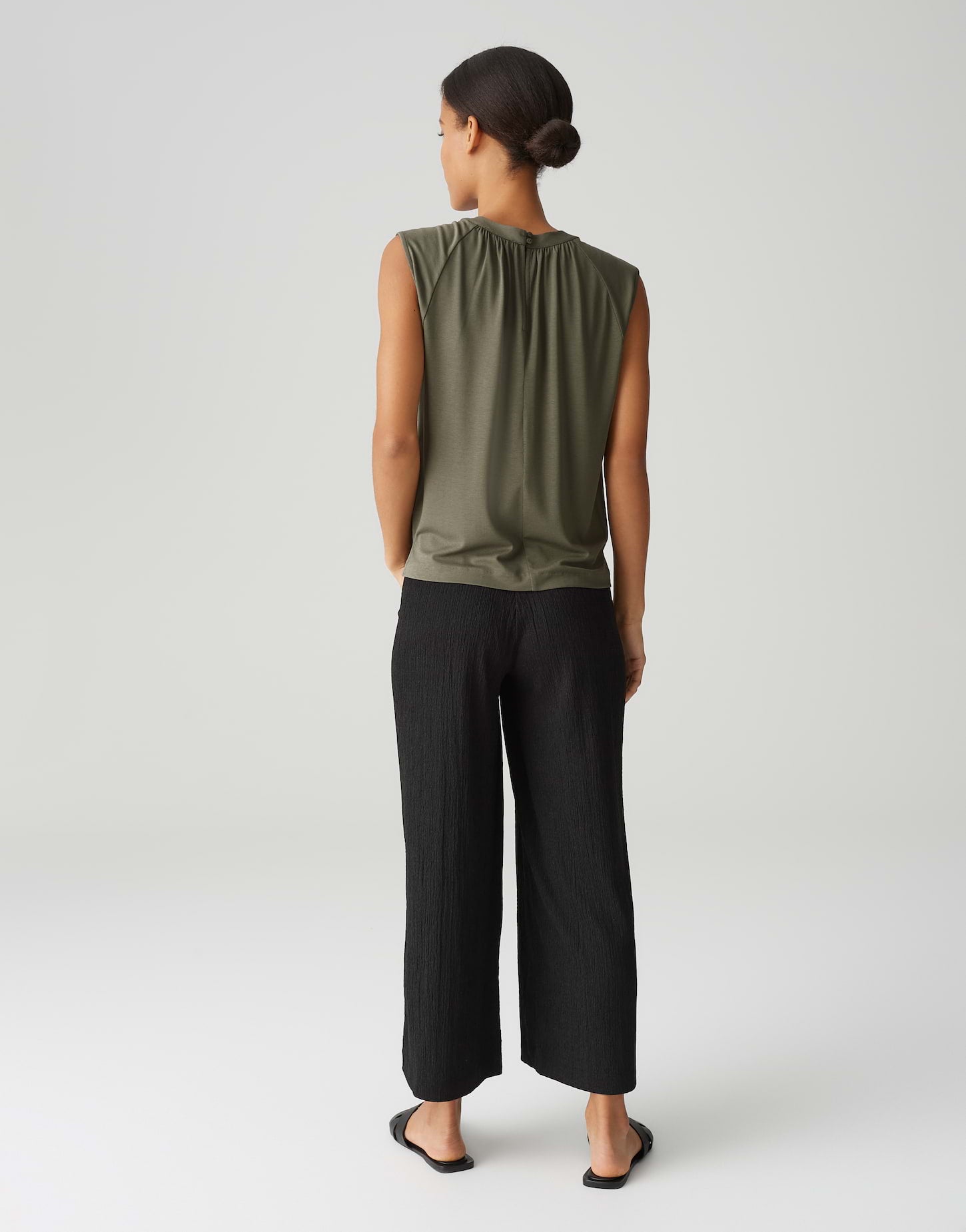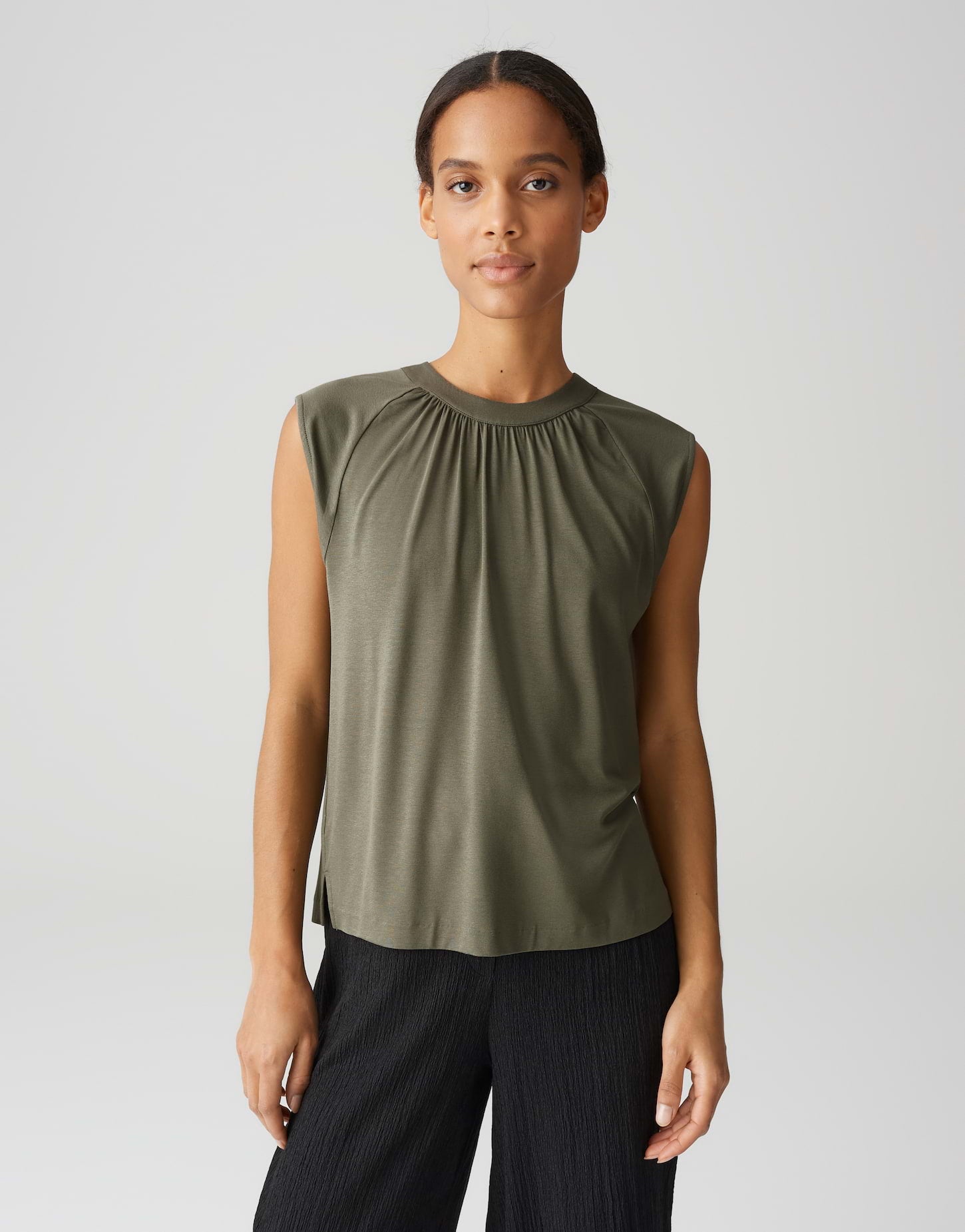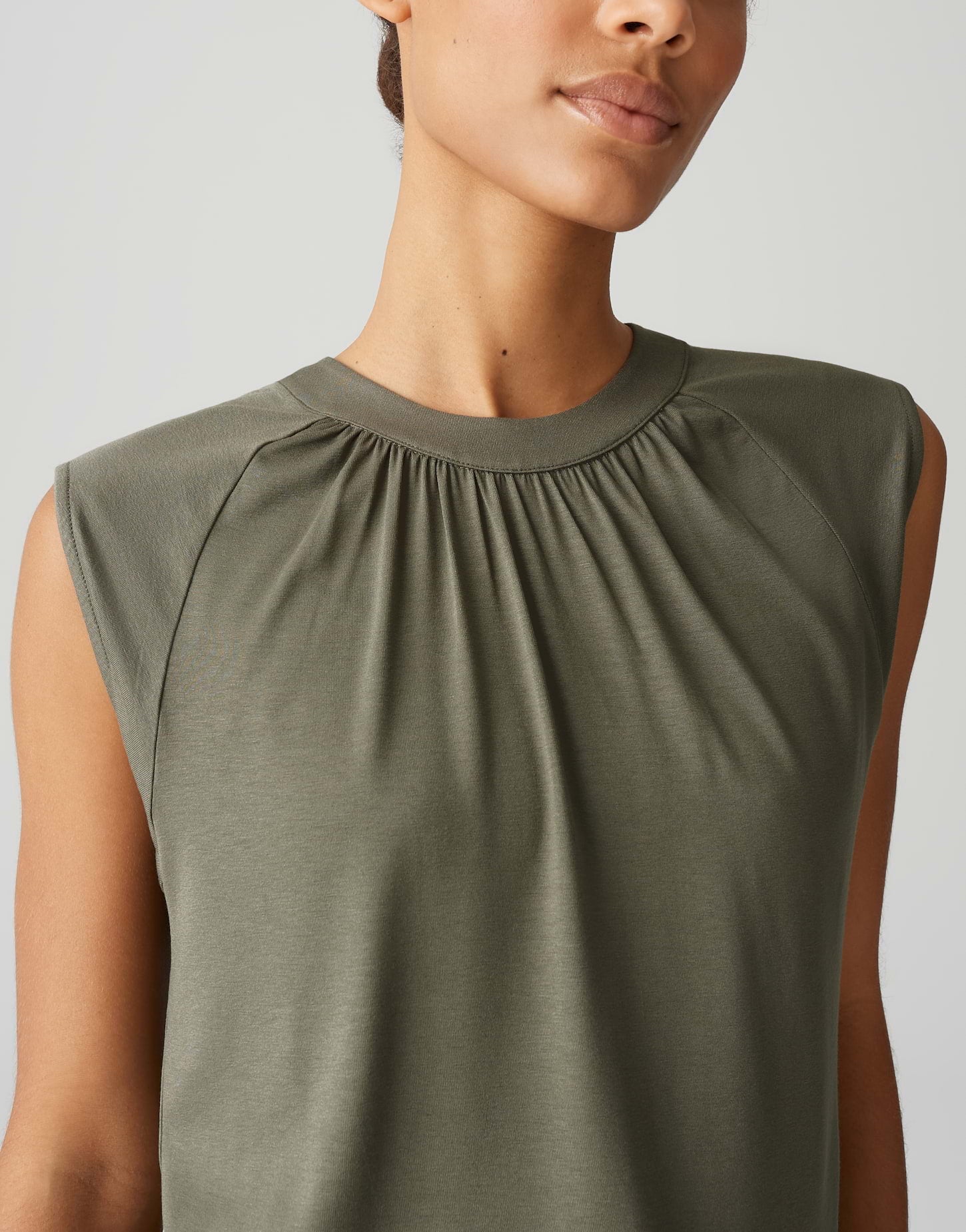 lockere Passform, gerader Schnitt, normale Länge, Nullarm, Rundhalsausschnitt, Rückenlänge ca. 57 cm bei Größe 36, Model Größe 176 cm ? trägt Größe 36, Jersey, glatter Griff, weich fließender Fall, elastischer Stoff, Kräuselung am Halsloch, Knopf mit Öse im Rücken, kleine Schlitze in den Seiten, Raglanärmel