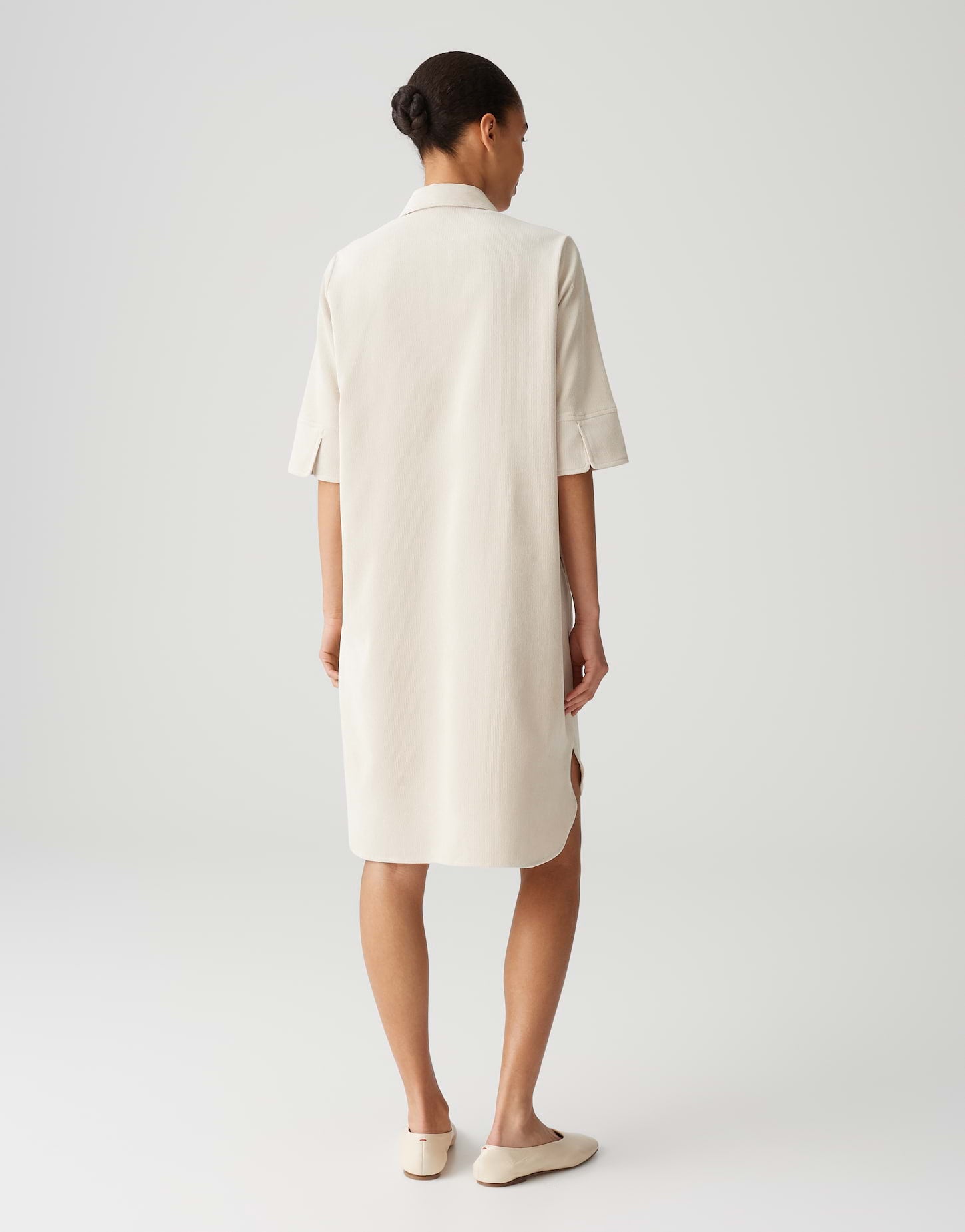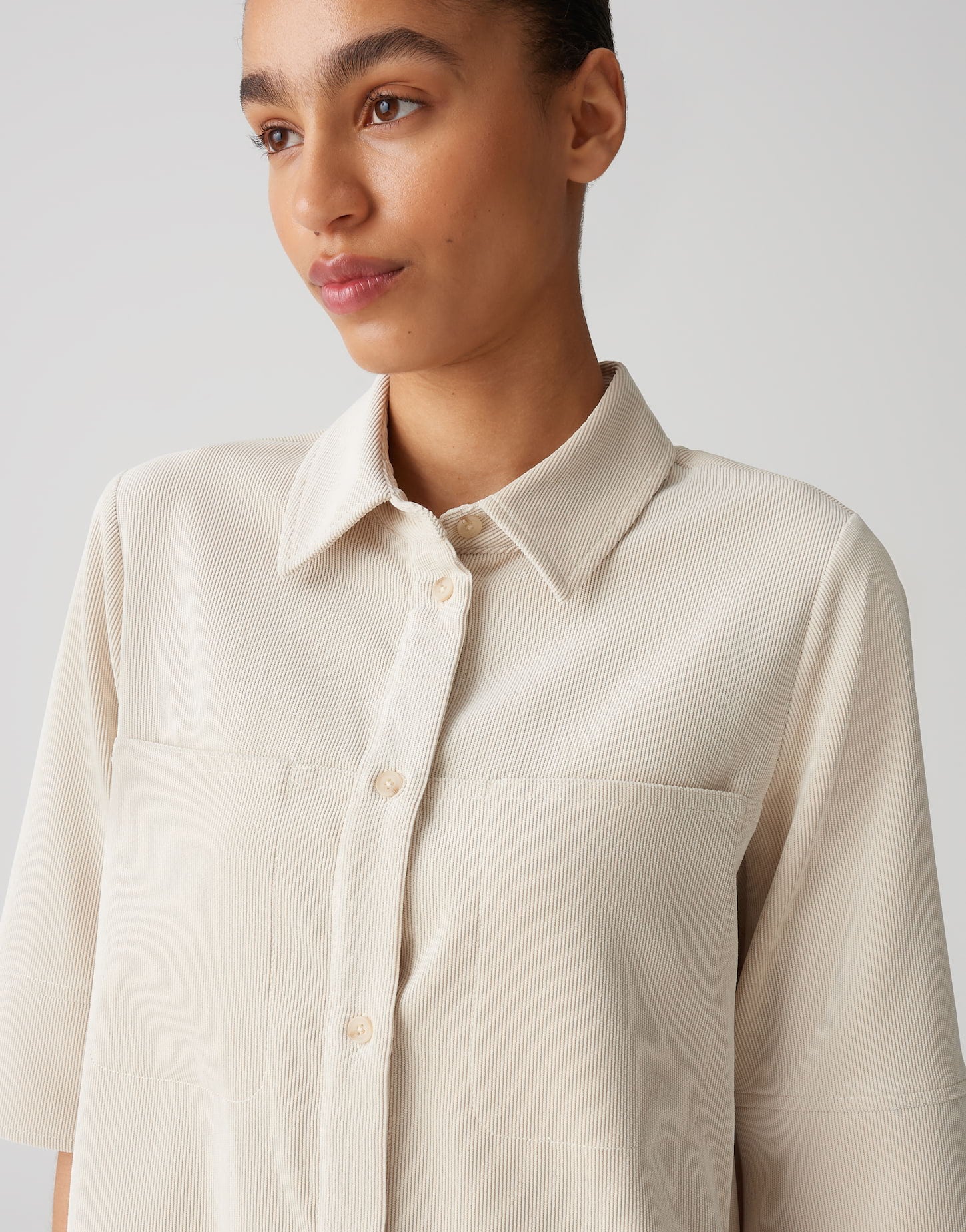 lockere Passform, gerader Schnitt, hinten länger als vorne, Halbarm, Hemdblusenkragen, Rückenlänge ca. 101 cm bei Größe 36, Model Größe 177 cm ? trägt Größe 36, Cord, feine Rippstruktur, weicher Griff, weich fließender Fall, Eingrifftaschen in den Seiten, abgesteppte Brusttaschen, abgerundeter Saum, Knopfleiste