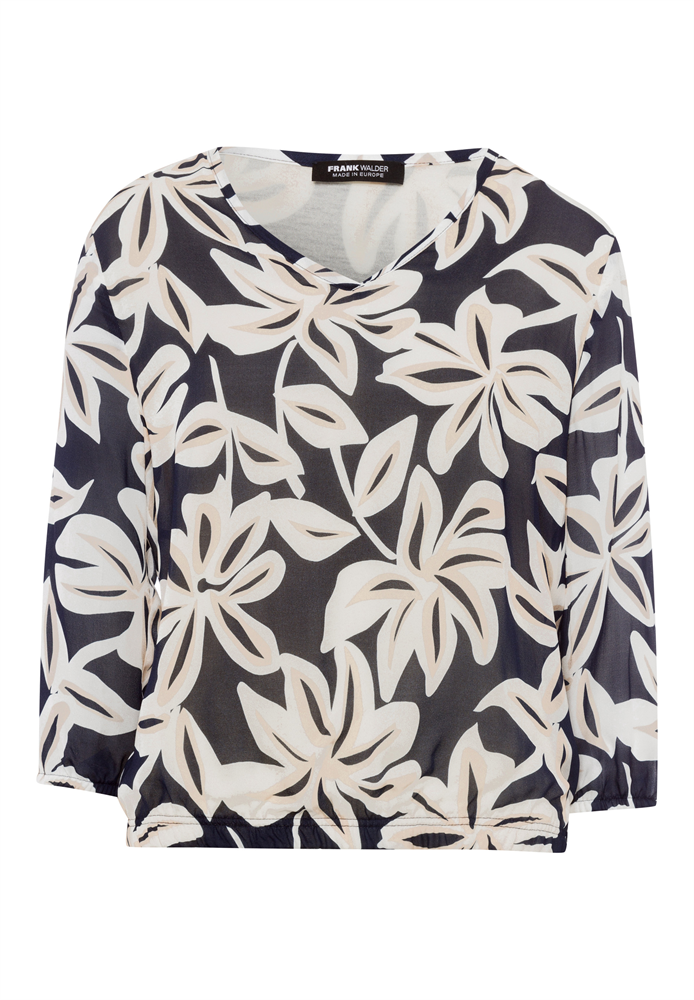 Druckbluse in fließender luftig-leichter Viskosequalität schön interpretiert - floraler Print in harmonischer Farbkombination. Hübsch verarbeitete Blende am V-Ausschnitt und mit figurfreundlichem Gummizug im Saum und Armsaum.