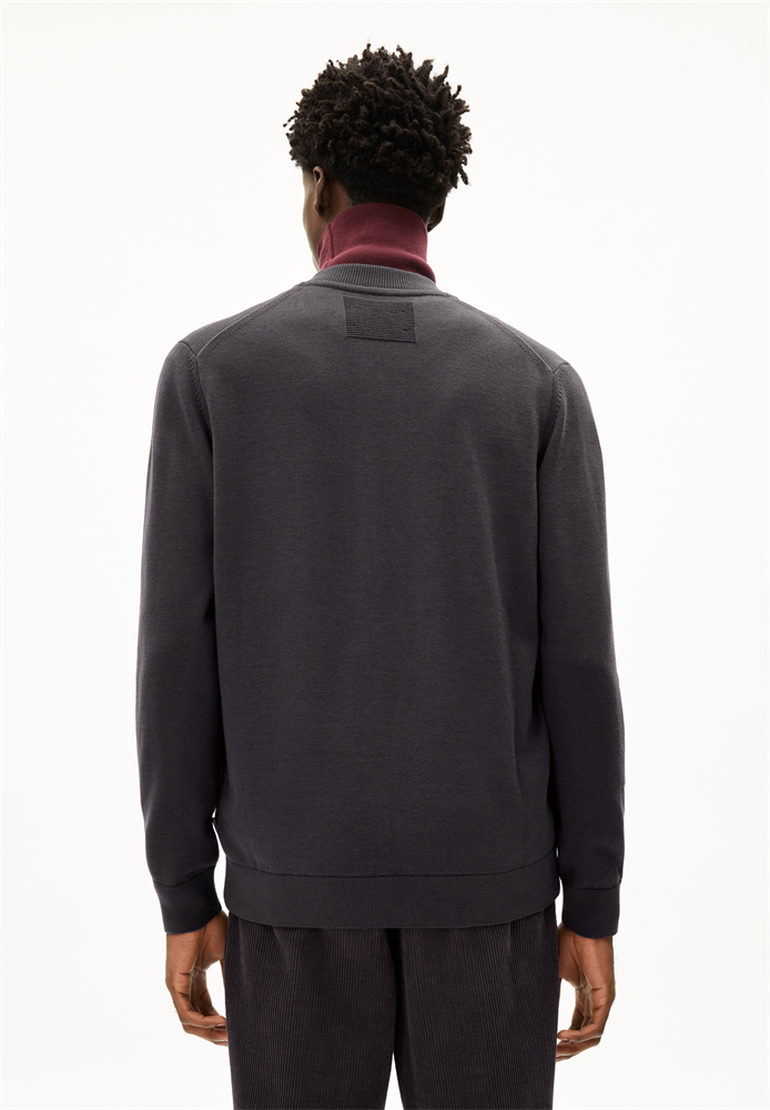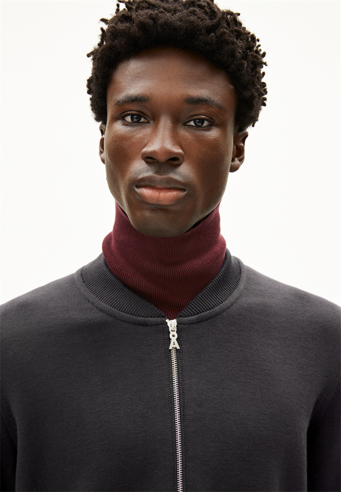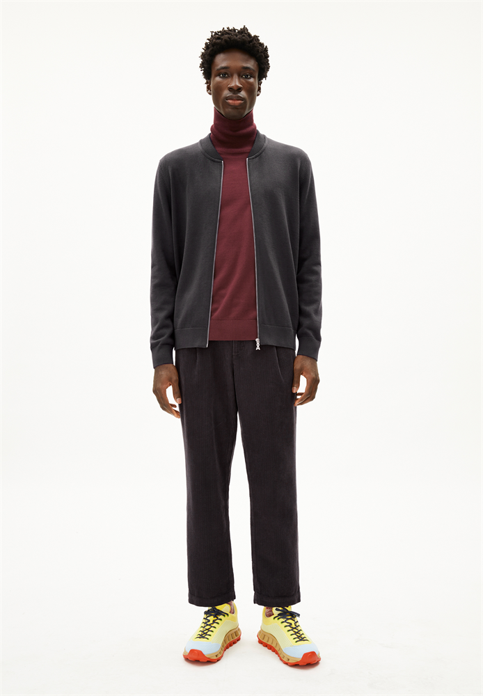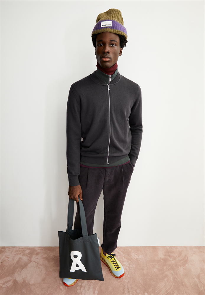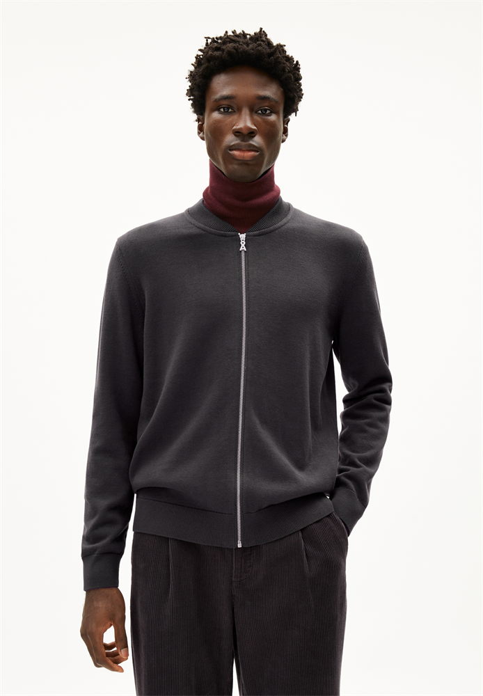 Our AGAAMON knit cardigan, made from pure organic cotton, features a loose fit, a classic blouson collar, and a practical zipper.