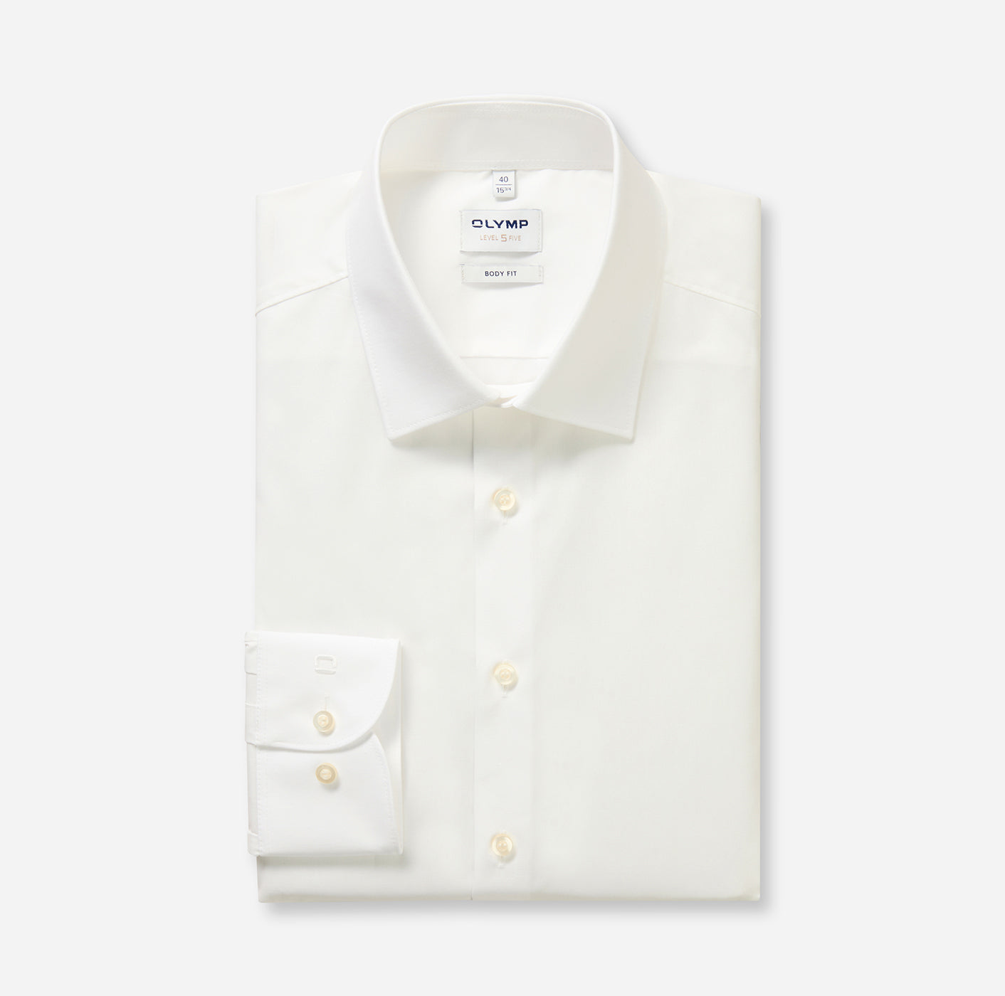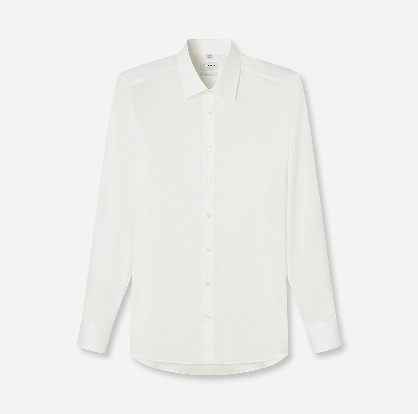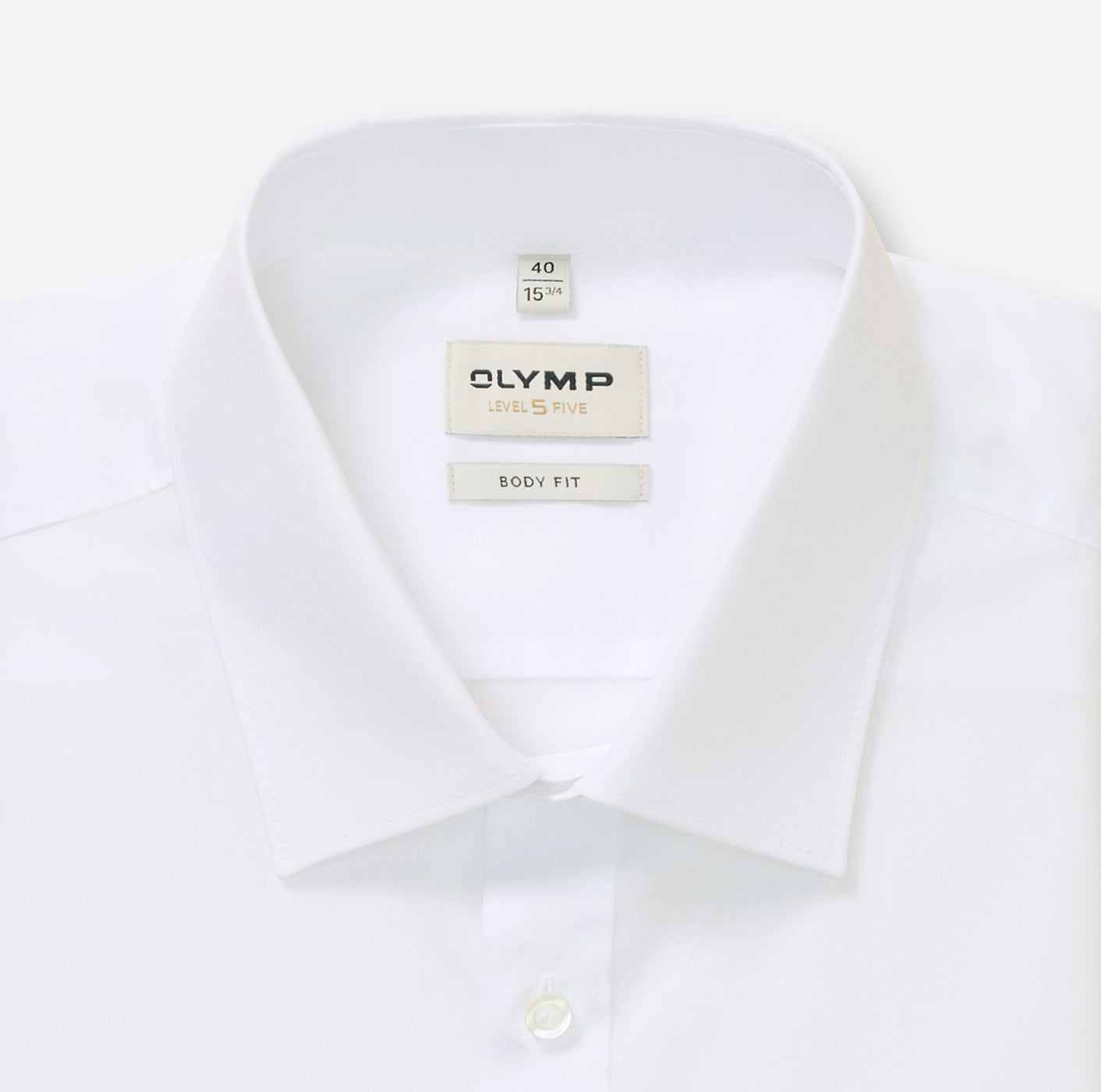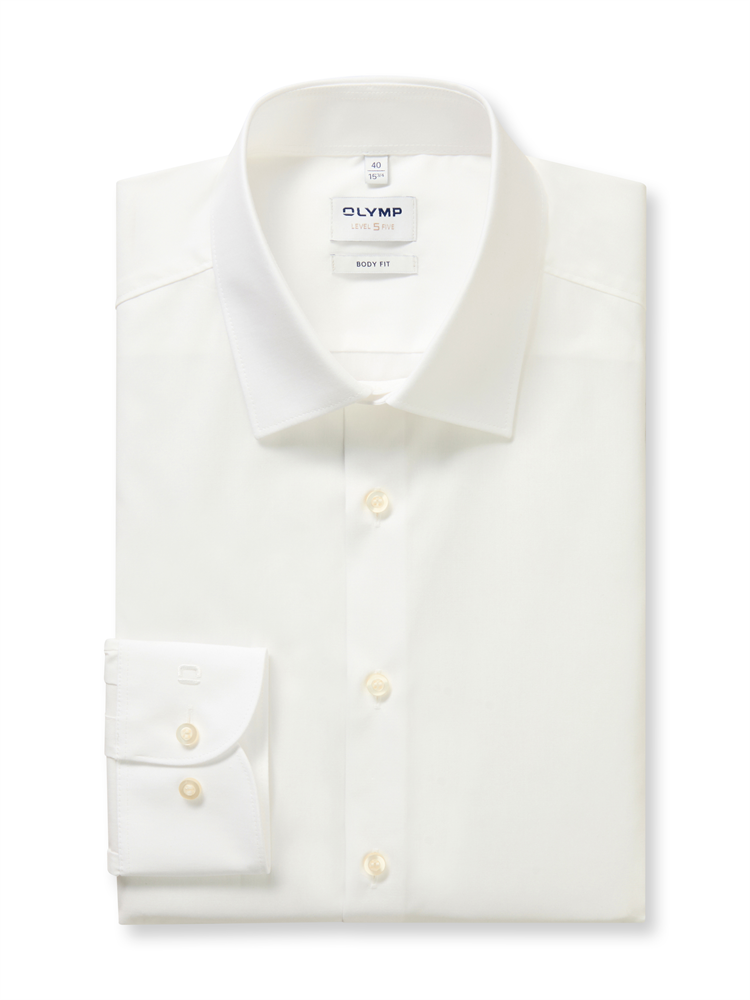 OLYMP Level Five ist das Businesshemd für den schlanken, modebewussten Mann. körperbetonte Schnittführung in Kombination mit modischen Produktdetails. OLYMP Level Five Hemden sind besonders bügelleicht und garantieren einen modisch-souveränen Auftritt. Das unifarbene Weiße Hemd ist ein wahrer Klassiker und kann mit dem eleganten New-York-Kent-Kragen zu jedem Anlass getragen werden. Die taillierte Body-fit-Passform sorgt für grenzenlose Bewegungsfreiheit dank Comfort Stretch.