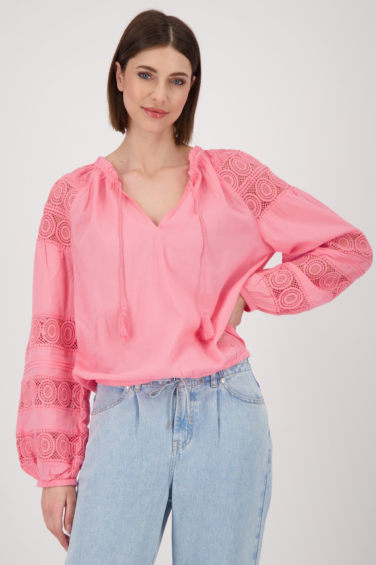 Die Bluse aus Baumwolle und Modal ist mit einem eleganten Spitzeneinsatz versehen. Der Rundhalsausschnitt mit Schlitz und Raffung sowie das Bindeband mit Quaste verleihen der Bluse einen besonderen Look.