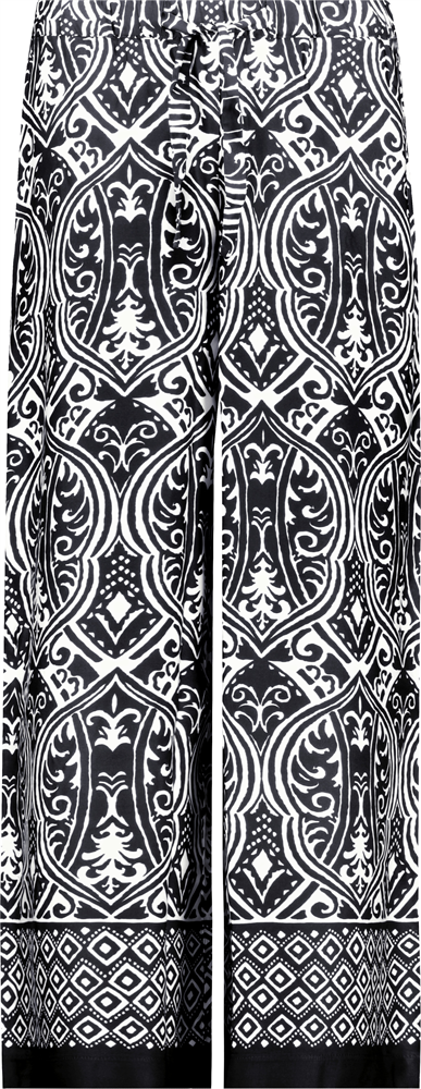 Erleben Sie Eleganz mit der fließenden Viskose-Palazzo-Hose, verziert mit Ornament-Muster, Seiden-Optik und praktischen Seitentaschen.