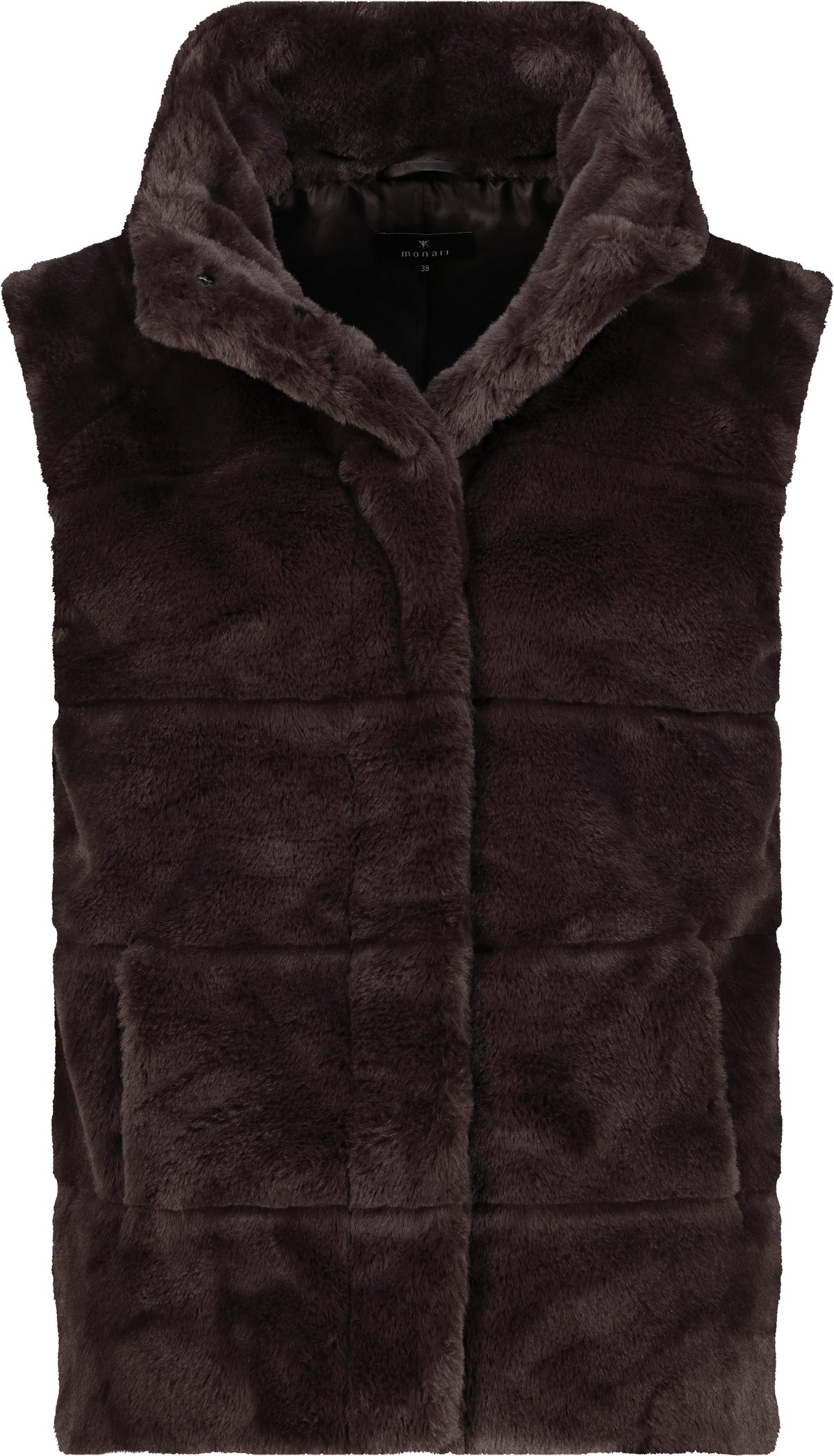 Eine flauschige Weste mit Stehkragen und seitlichen Eingrifftaschen.