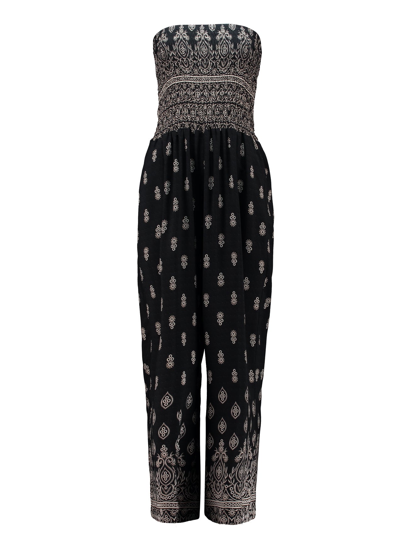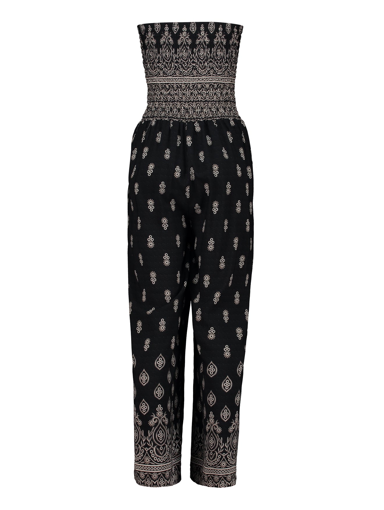 Gemusterter Jumpsuit ohne Ärmel. Lange, weite Beine.