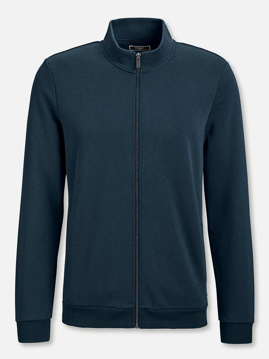 Die Refined Lounge Jacke in Dunkelblau kombiniert stilvolles Design mit praktischer Funktionalität. Hergestellt aus einer nachhaltigen, temperaturregulierenden Baumwoll-Mischung, bietet sie Komfort durch Eingriffstaschen und einen bequemen Bund mit Bindebändern.