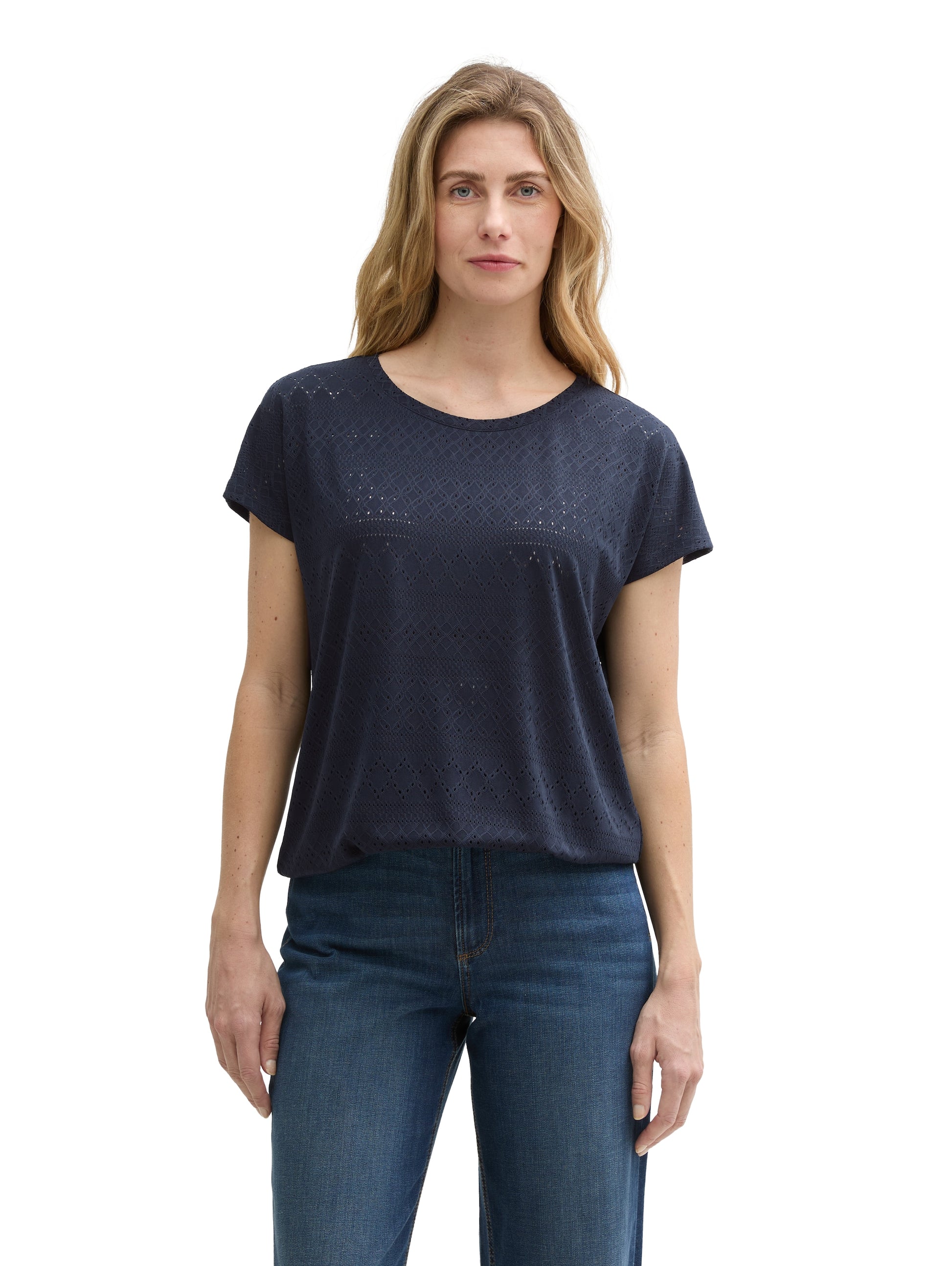 * Locker geschnittenes T-Shirt mit Lochmuster. Mit elastischem Gummibund am Saum und Schlitz-Detail auf der Rückseite. Aus einem strukturierten Jacquard-Stoff.