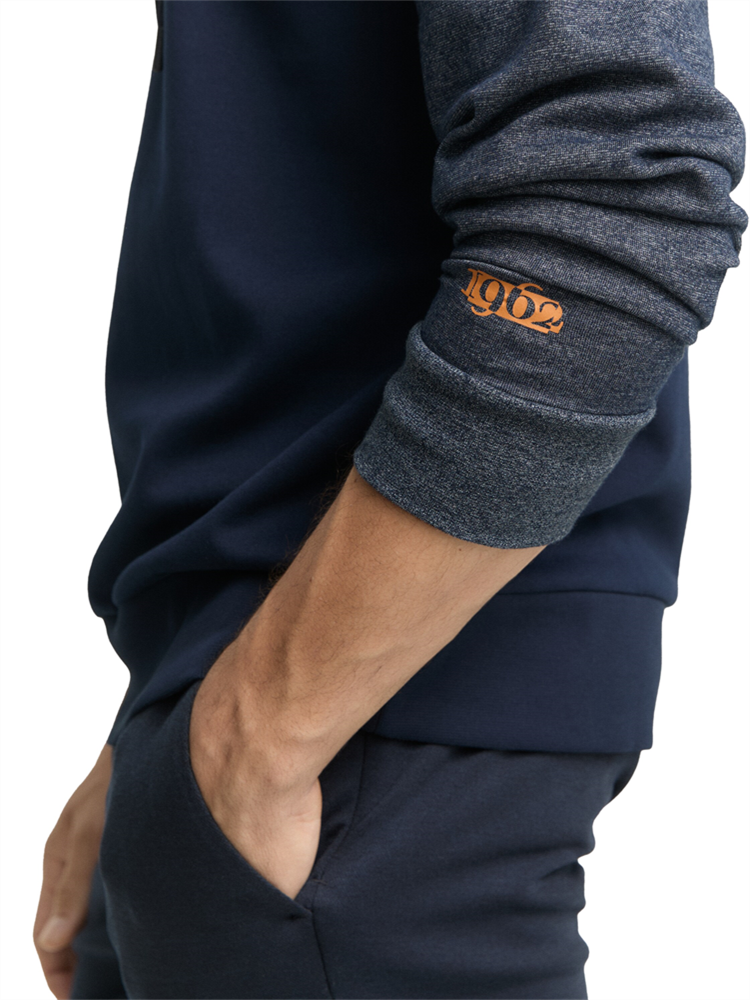 Sweatshirt im zweigeteilten Look mit weich angerautem Material in Melange-Optik oben und an den Ärmeln. Mit Kordelzug im Schalkragen, kleinem Logo-Badge auf der Brust und Print am Ärmel.