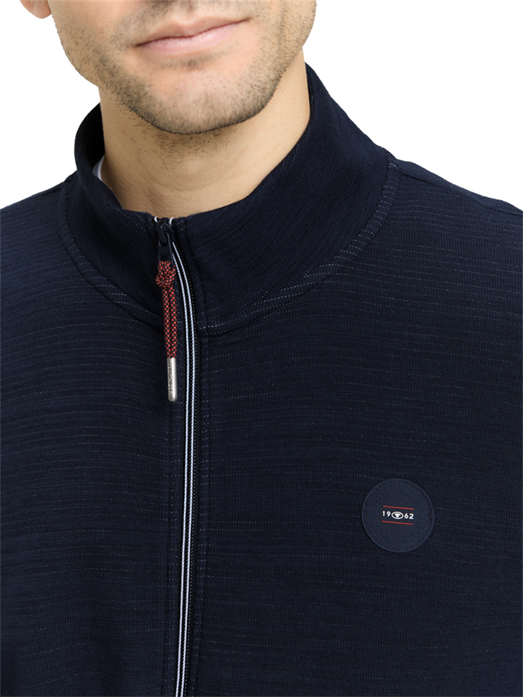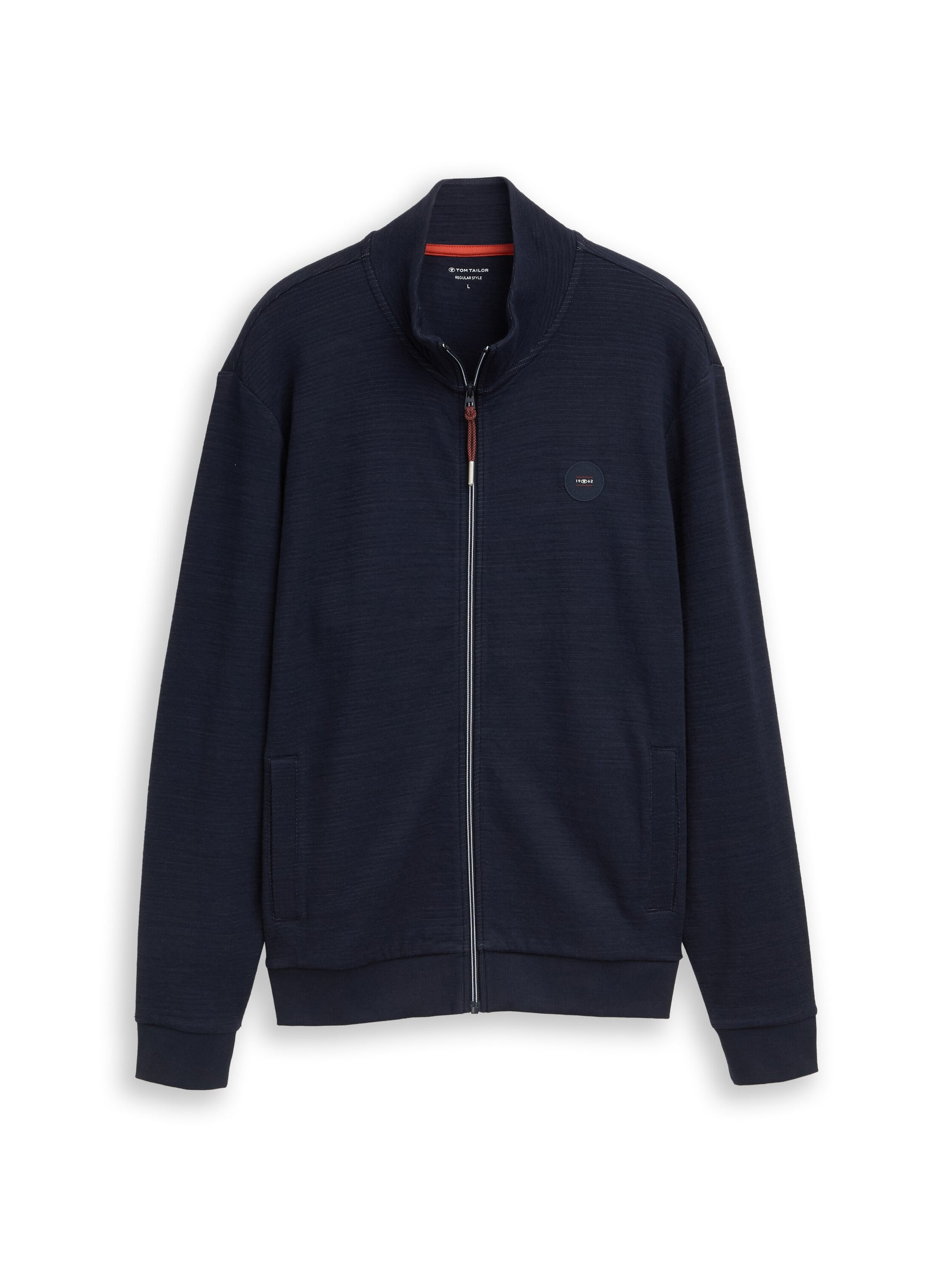 Leichte Sweatjacke mit Stehkragen, seitlichen Eingriffstaschen und Logo-Badge auf der Brust. Aus einem strukturierten Baumwollstoff.