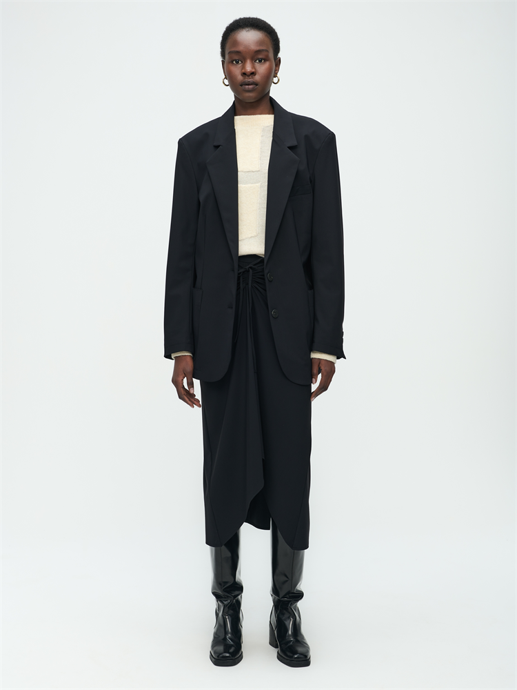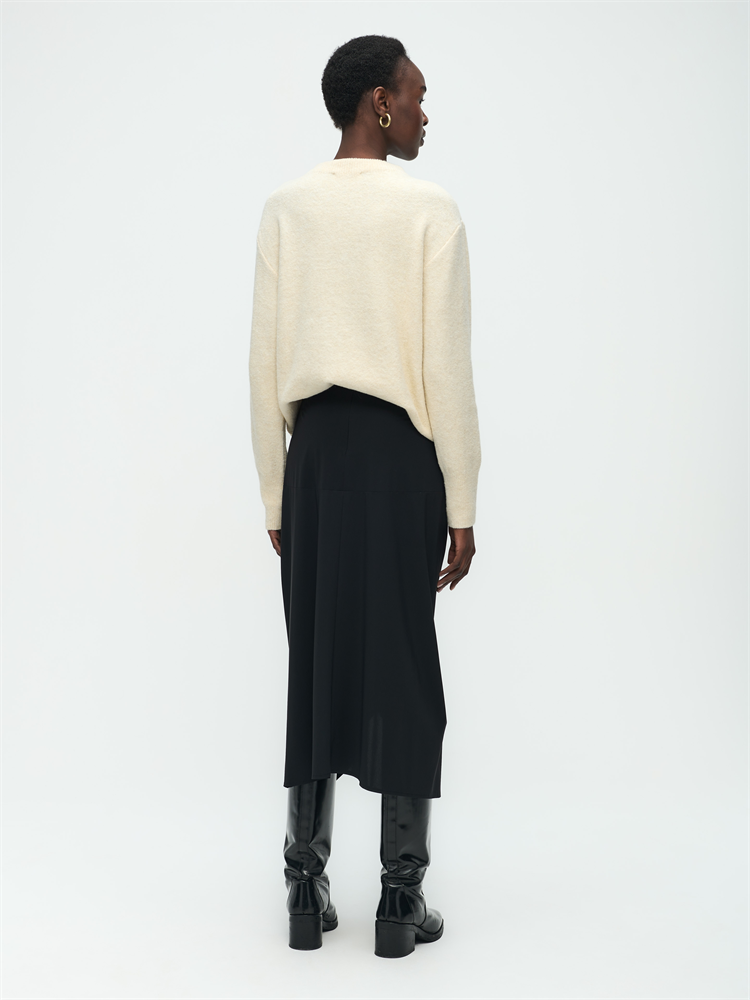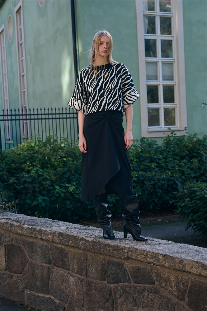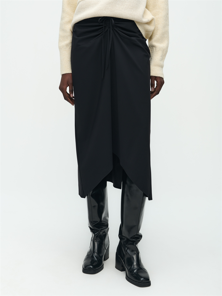 Entdecken Sie die Eleganz des Tine Rocks, der aus Hightech-Jersey gefertigt ist. Dieser mittellange Rock hat ein einzigartiges Tulpen-Detail auf der Vorderseite, das einen Hauch von Raffinesse und modernem Flair verleiht.