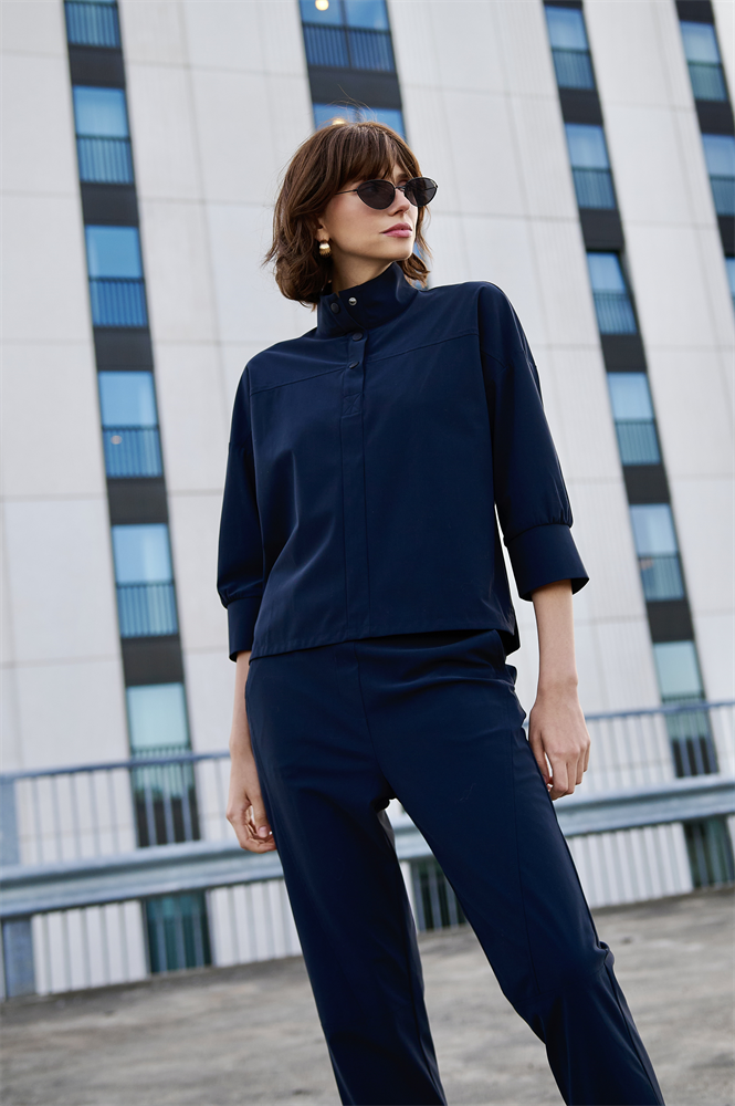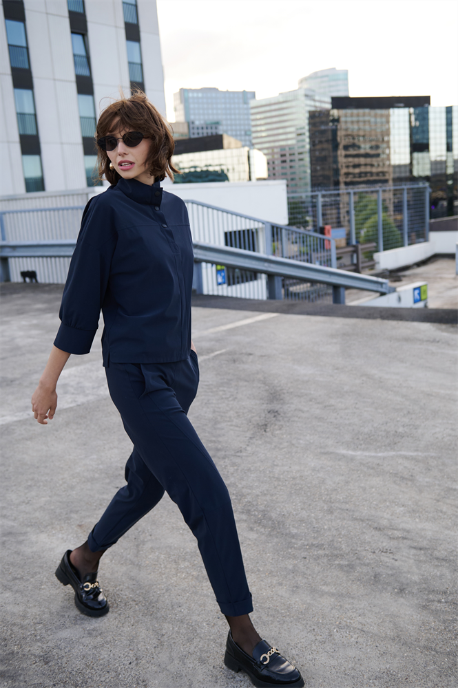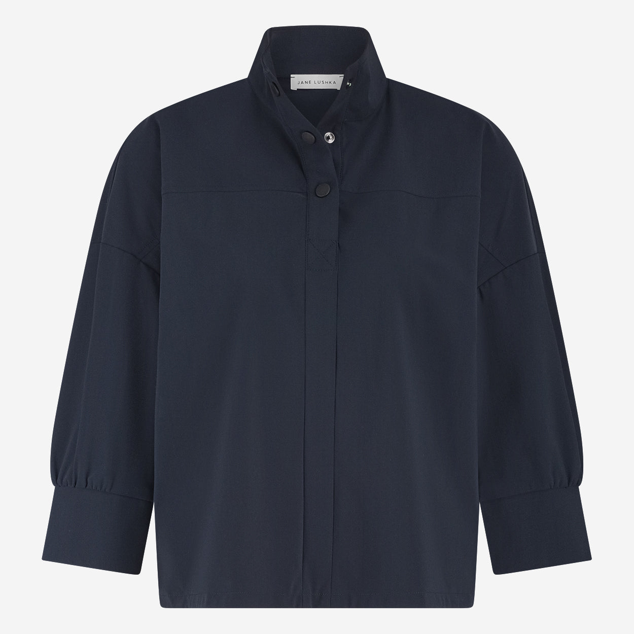 Mit einem markanten strukturierten Design verbindet das Angelika Top sportliche Elemente mit eleganter Raffinesse. Aus weichem technischem Jersey mit gebürsteter Wildlederoptik gefertigt, besticht dieses Top durch seinen modernen Funnelkragen und die schmale Druckknopfleiste. Die ¾-Ärmel und die minimalistische Silhouette machen es zu einem edlen Lagenlook für kältere Tage oder einem selbstbewussten Einzelstück.
