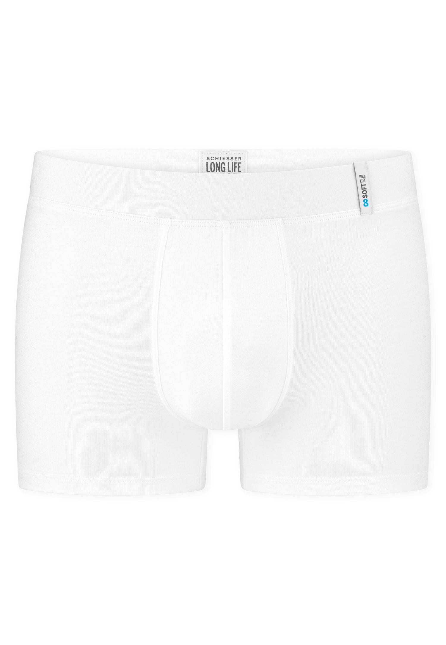 weiße, körpernahe Shorts für Herren, aus der SCHIESSER-Serie Long Life Soft, optimales Feuchtigkeitsmanagement dank ausgeglichenem Micromodal-Anteil, höchste Qualität und Langlebigkeit durch einzigartige „ReaLasting Cotton“-Verarbeitung, perfekte Passform und Formstabilität dank 10% Elastan, reduzierte Pilling-Bildung und glatte, gleichmäßige Oberfläche mit natürlichem Glanz, in hochwertiger, elastischer Single-Jersey-Qualität