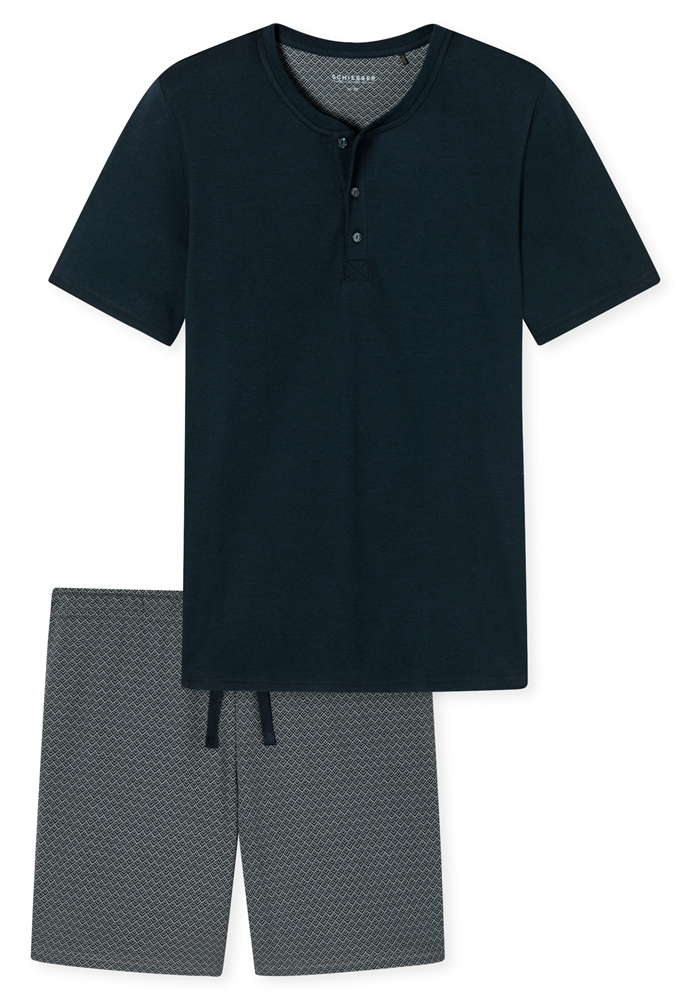 kurzer Schlafanzug für Herren, aus der SCHIESSER-Serie „Fine Interlock“, dunkelblaues T-Shirt, Serafino-Kragen und funktionale Knopfleiste, Shorts mit Minimalprint in verschiedenen Blautönen, bequemer Bund mit dunkelblauer Bindekordel, in hochwertiger, angenehm softer Feininterlock-Qualität