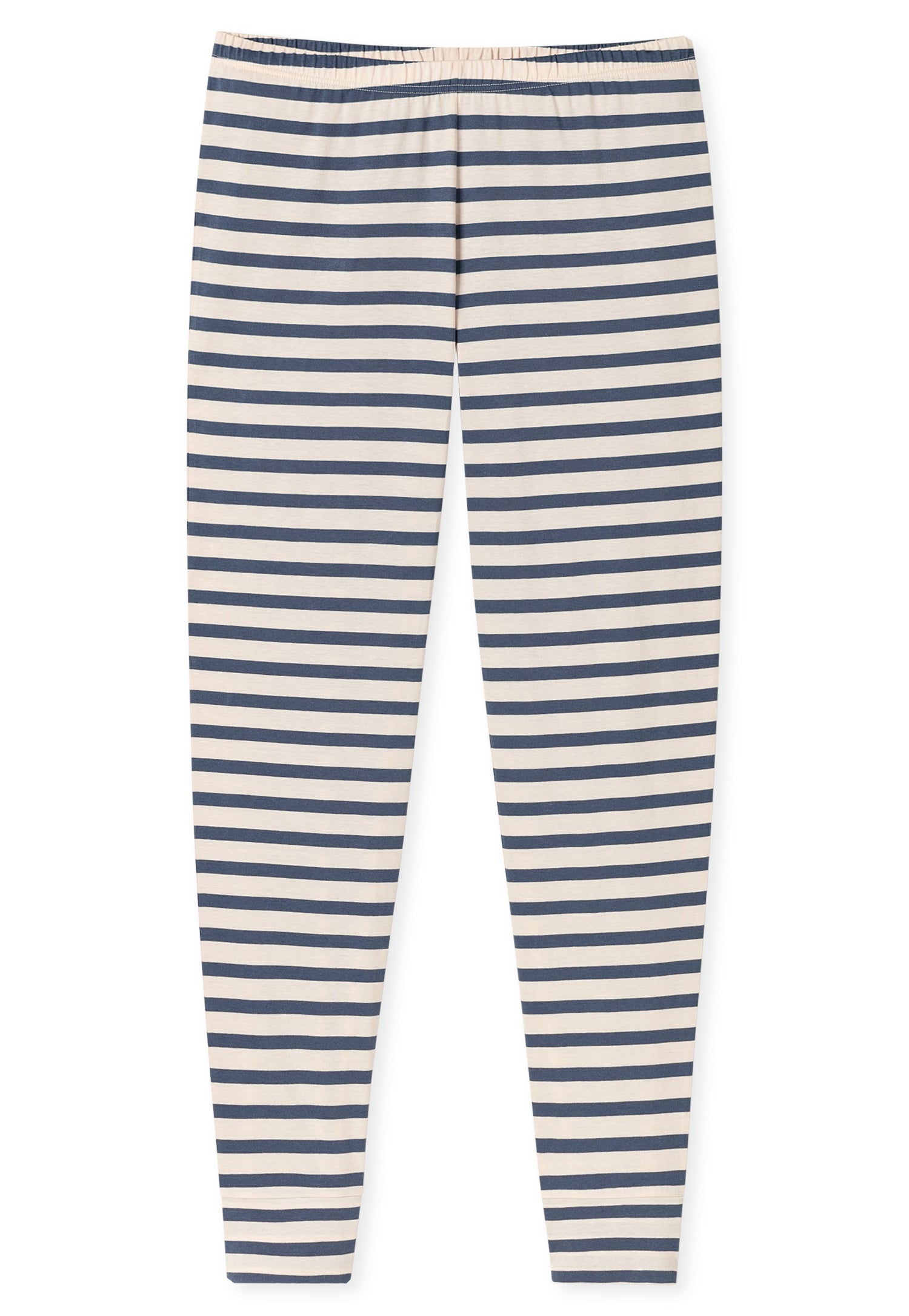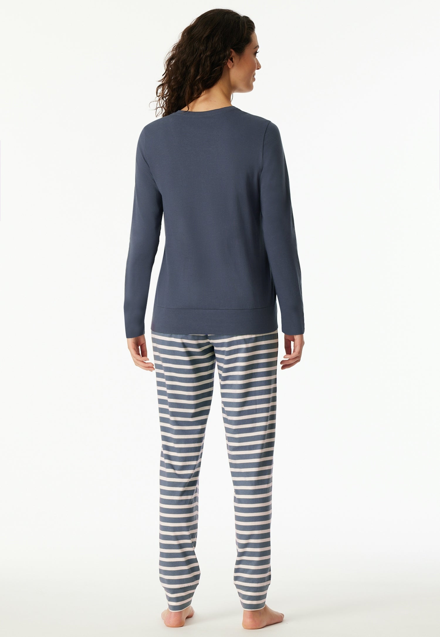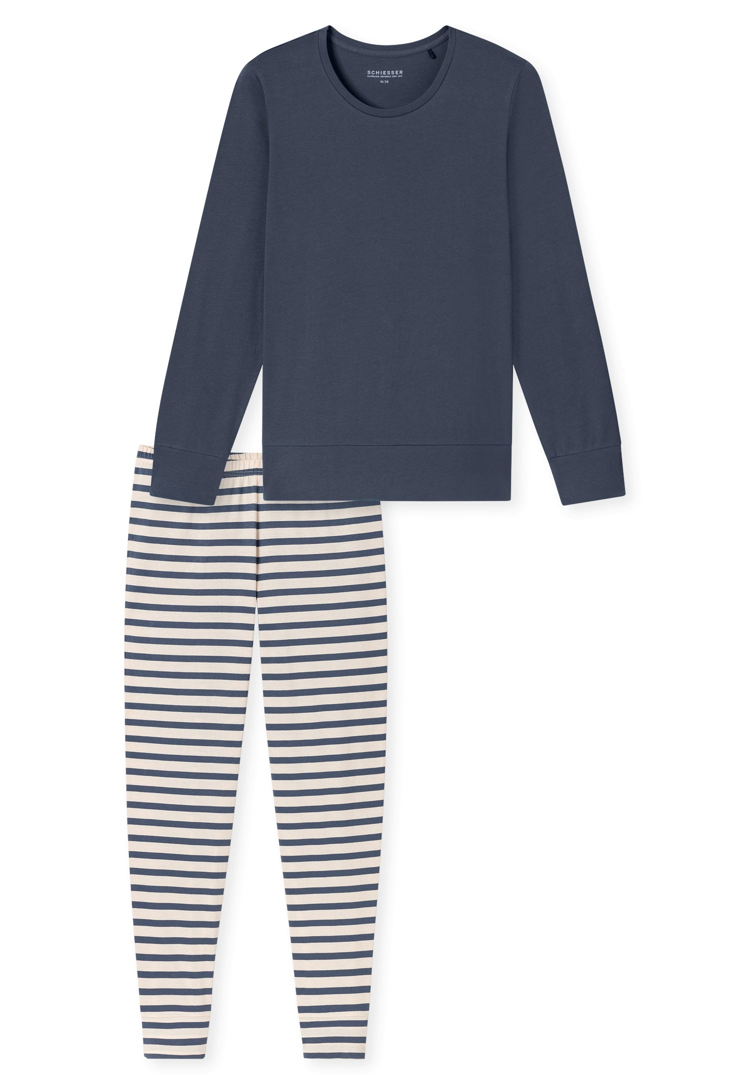 jeansblauer Damenschlafanzug mit geringelter Hose in Champagner-Jeansblau, aus der SCHIESSER Serie "Casual Essentials", Oberteil in Uni mit Rundhalsausschnitt, Hose mit Streifen und Bündchenabschlüssen, unsere Models tragen Größe 38/M, in softer Single-Jersey-Qualität