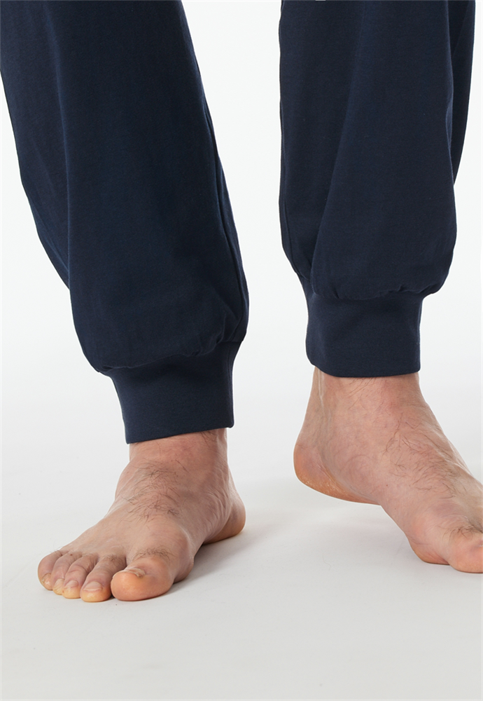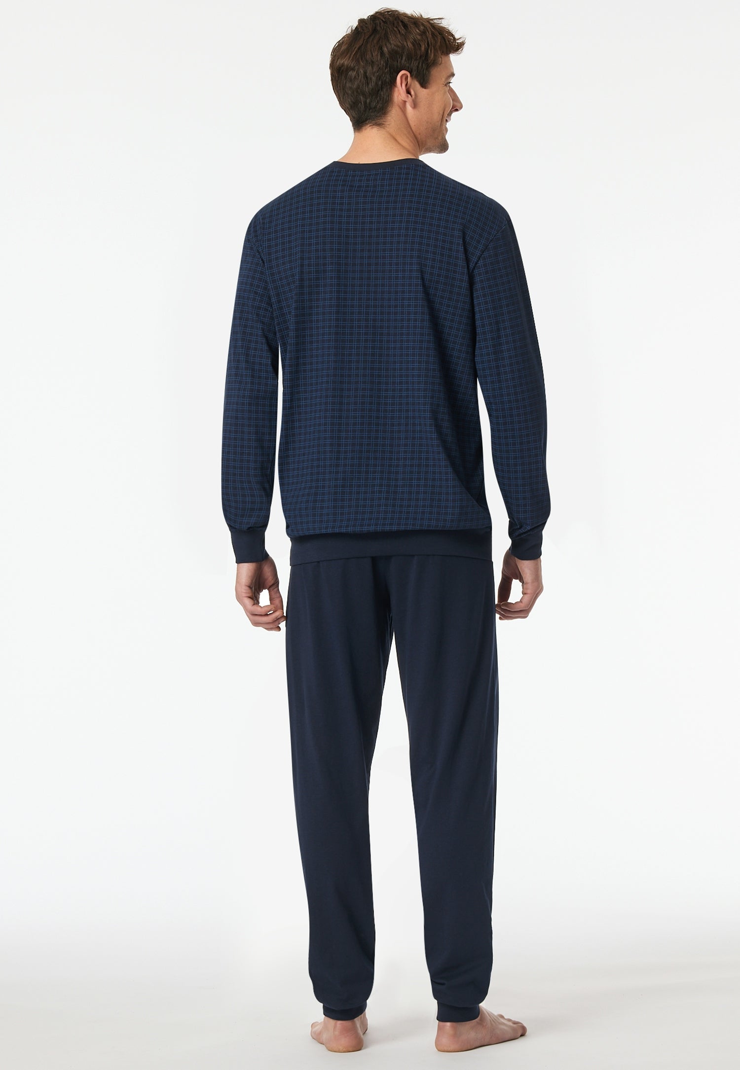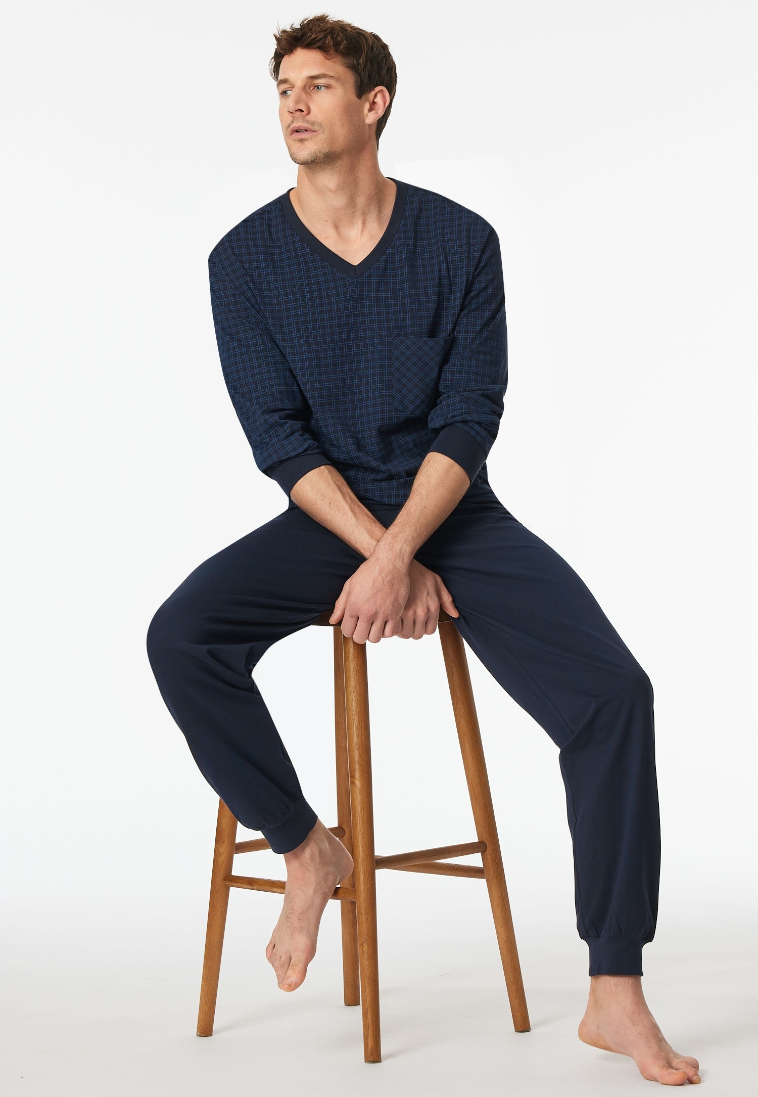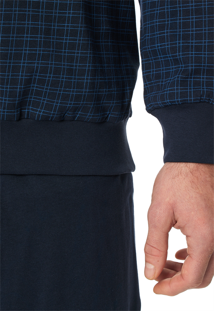 langer, nachtblauer Herrenschlafanug mit kariertem Oberteil, aus der SCHIESSER Kollektion "Comfort Essentials", mit komfortablen Bündchen an den Arm- und Beinabschlüssen sowie am Oberteil-Bund, gemustertes Oberteil mit V-Ausschnitt, aufgesetzte Brusttasche , Hose in Uni, in weicher Single-Jersey-Qualität