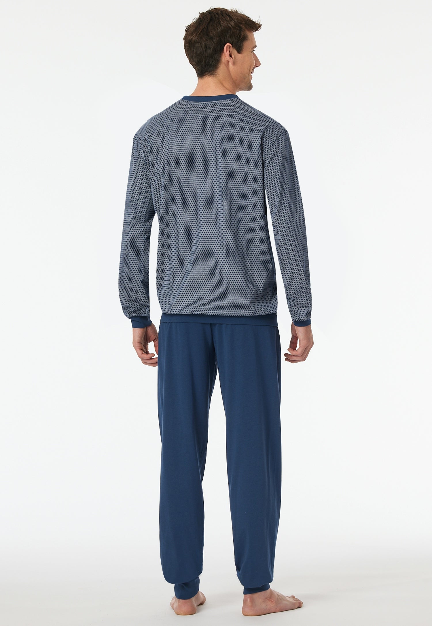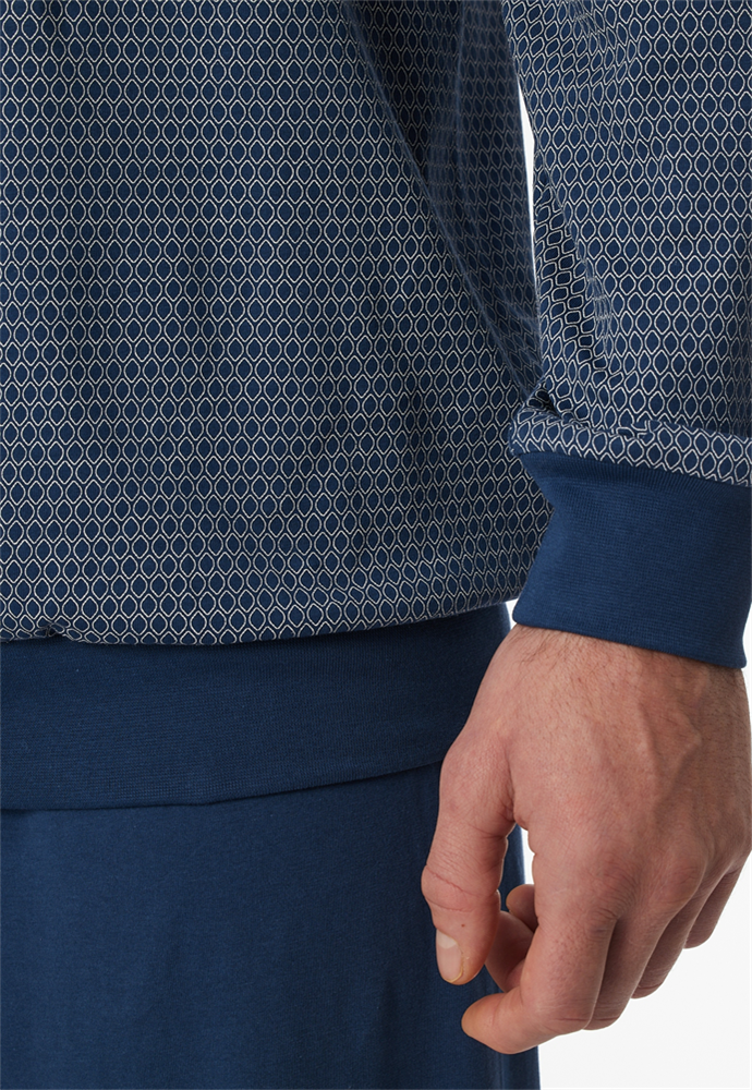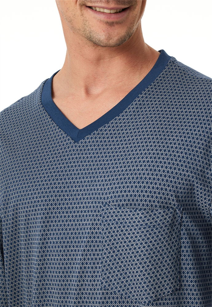 langer, blauer Herrenschlafanug mit gemustertem Oberteil, aus der SCHIESSER Kollektion "Comfort Essentials", mit komfortablen Bündchen an den Arm- und Beinabschlüssen sowie am Oberteil-Bund, gemustertes Oberteil mit V-Ausschnitt, aufgesetzte Brusttasche , Hose in Uni, in weicher Single-Jersey-Qualität