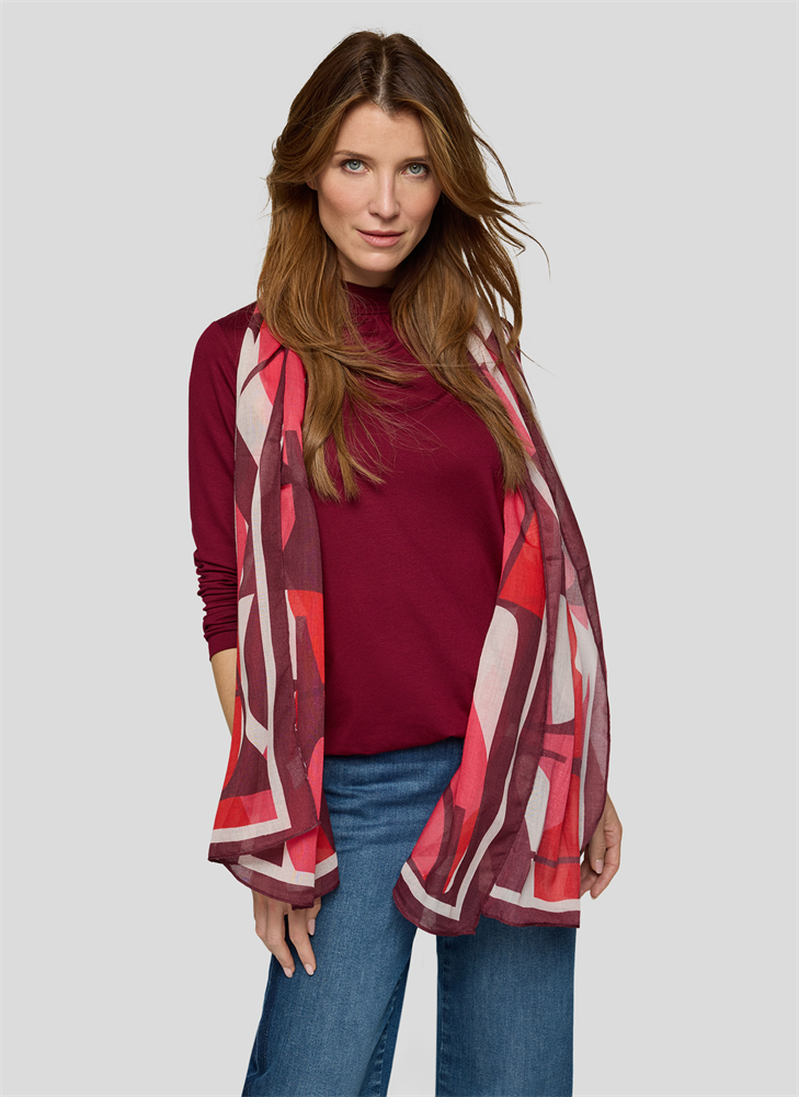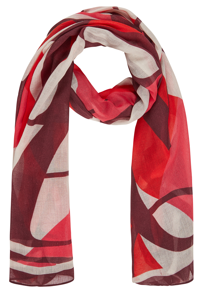 Dieser Schal bringt mit seinem schwungvollen Allover-Muster frische Akzente in jedes Outfit. Die Kombination aus transparentem Material und grafischem Design in Rot- und Beigetönen wirkt modern und stilvoll zugleich. Ob locker um den Hals gelegt oder als Farbtupfer zur Jacke _ das Accessoire ist ein vielseitiger Begleiter mit modischem Statement. Auffälliger Allover-Print. Angenehm weich und luftig. Ideal für Übergangszeit.
