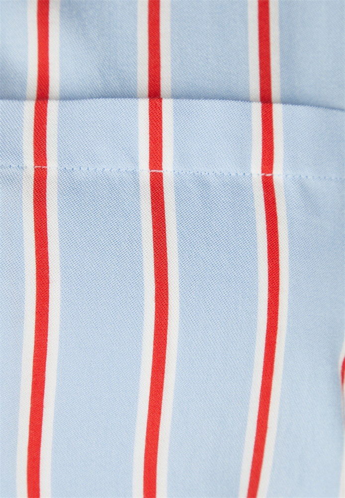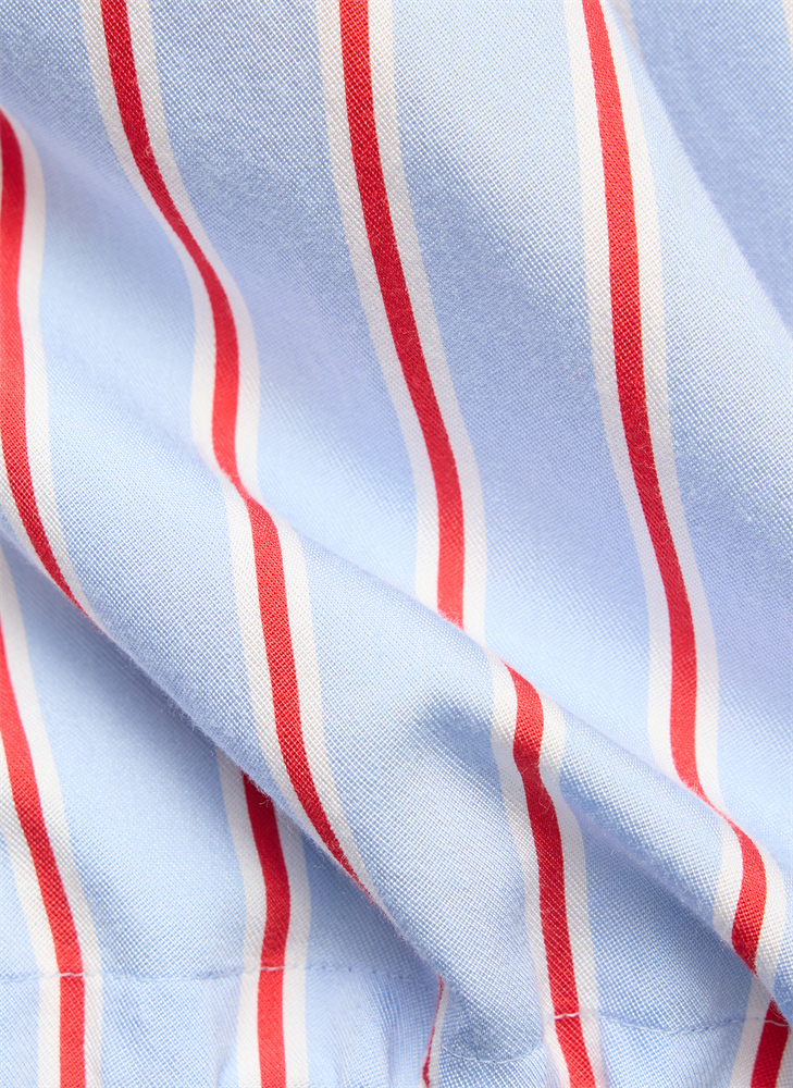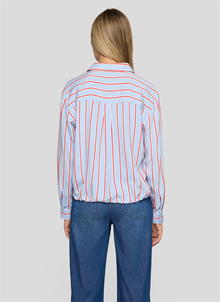 Diese Hemdbluse kombiniert klassische Elemente mit sportivem Twist: Der lockere Schnitt und der leichte Baumwollstoff bieten angenehmen Tragekomfort, während der Tunnelzug am Saum für eine individuelle Silhouette sorgt. Vertikale Streifen in Rot und Weiß auf hellblauem Grund verleihen der Bluse eine frische, moderne Ausstrahlung. Der Rücken ist mit einer quer verlaufenden Passe gearbeitet, die das Design harmonisch abrundet. Tunnelzug am Saum. Klassischer Hemdkragen. Vertikales Streifenmuster. Brusttasche links.
