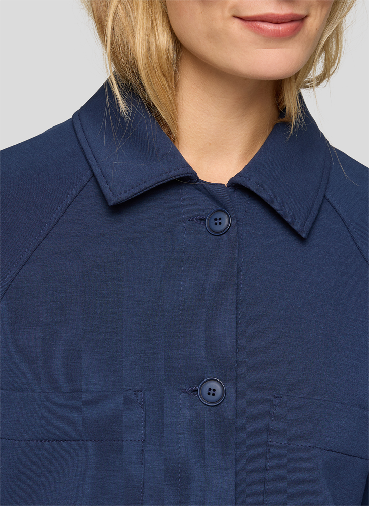 Die modische Kurzjacke überzeugt mit ihrer klaren Linienführung und der sportlich-eleganten Optik. Zwei große, aufgesetzte Taschen auf der Vorderseite bieten praktischen Stauraum und unterstreichen das cleane Design. Dank des weichen, strukturierten Materials trägt sich die Jacke angenehm und eignet sich perfekt als Übergangsjacke oder stilvoller Blazer-Ersatz. Kompakte Jerseyqualität. Aufgesetzte Fronttaschen. Mit Hemdkragen und Knopfleiste. Gerade, leicht verkürzte Passform. Ungefüttert für mehr Bewegungsfreiheit.