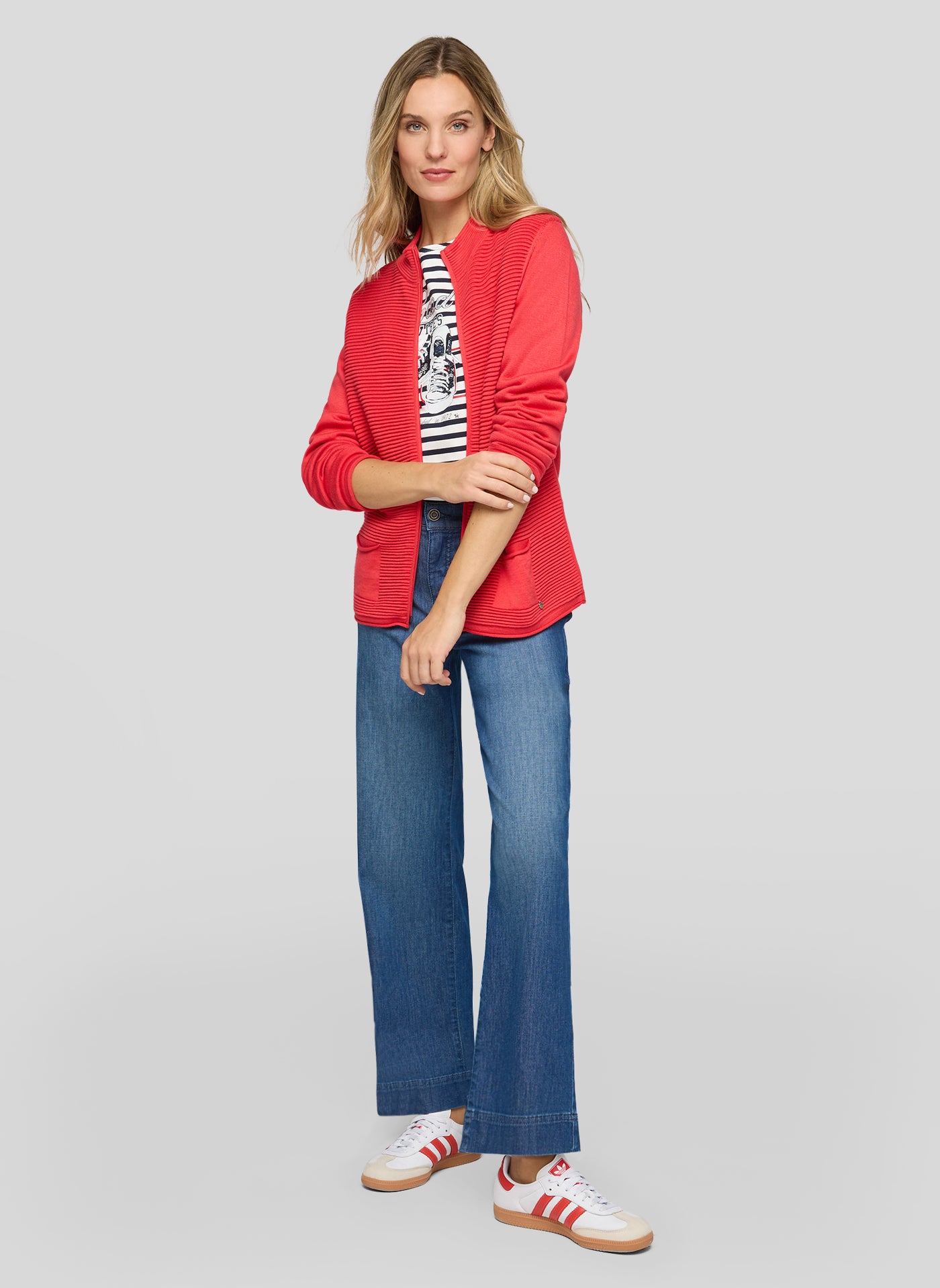 Diese Jacke überzeugt durch ihr raffiniertes Spiel mit Struktur: Die Vorderseite ist mit einer feinen Rippenstruktur gearbeitet, während Ärmel und Rückseite glatt gehalten sind. Der durchgehende Reißverschluss mit Ringzipper rundet den Look sportlich ab. Zwei aufgesetzte Taschen vorn bieten Platz für Kleinigkeiten. Die weiche Baumwollmischung liegt angenehm auf der Haut und sorgt für ein gutes Tragegefühl. Mit strukturiertem Frontbereich. Aufgesetzte Taschen vorn. Durchgehender Reißverschluss. Kleiner Stehkragen. Trageangenehme Baumwollmischung.